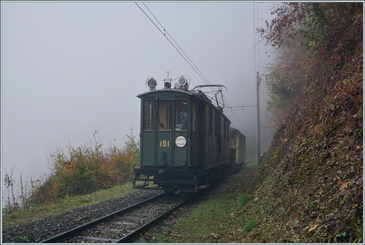 Der CGTE Strassenbahn Gepäcktriebwagen Fe 4/4 151 mit Beiwagen steht in Chamby zur Abfahrt bereit. Der von der B-C als Leihgabe an die Association Genevoise du Musée des Tramways abgegebene Fe 4/4 151 (Baujahr 1911) weilt für ein paar Wochen zu Besuch an der Riviera Vaudoise.