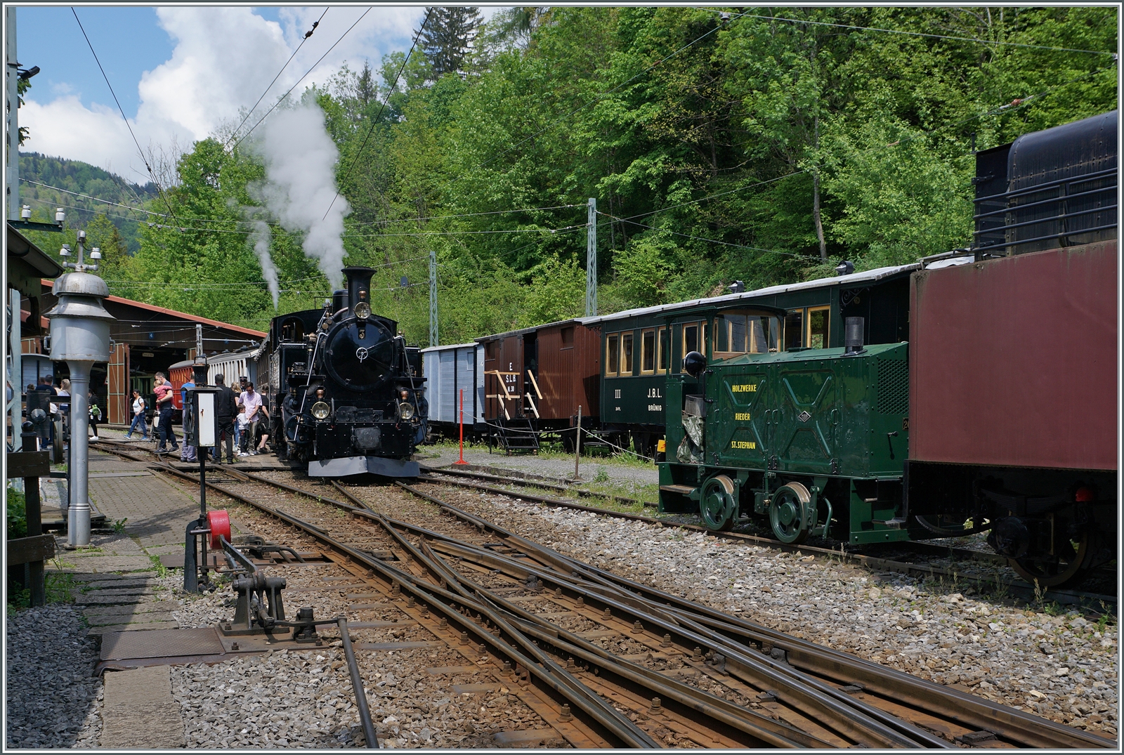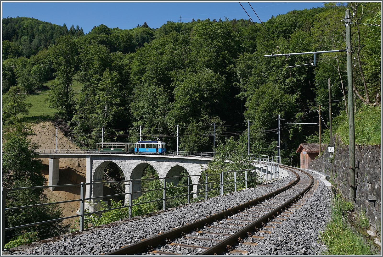 Der Triebwagen Ce 2/3 ex 28 der TL (Transports publics de la région lausannoise (deutsch Öffentliche Transporte der Region Lausanne)), ex Genève Veyrier 23, BVB 18, rangiert am 27.05.2012 im Museums-Areal der Museumsbahn Blonay–Chamby in Chaulin.