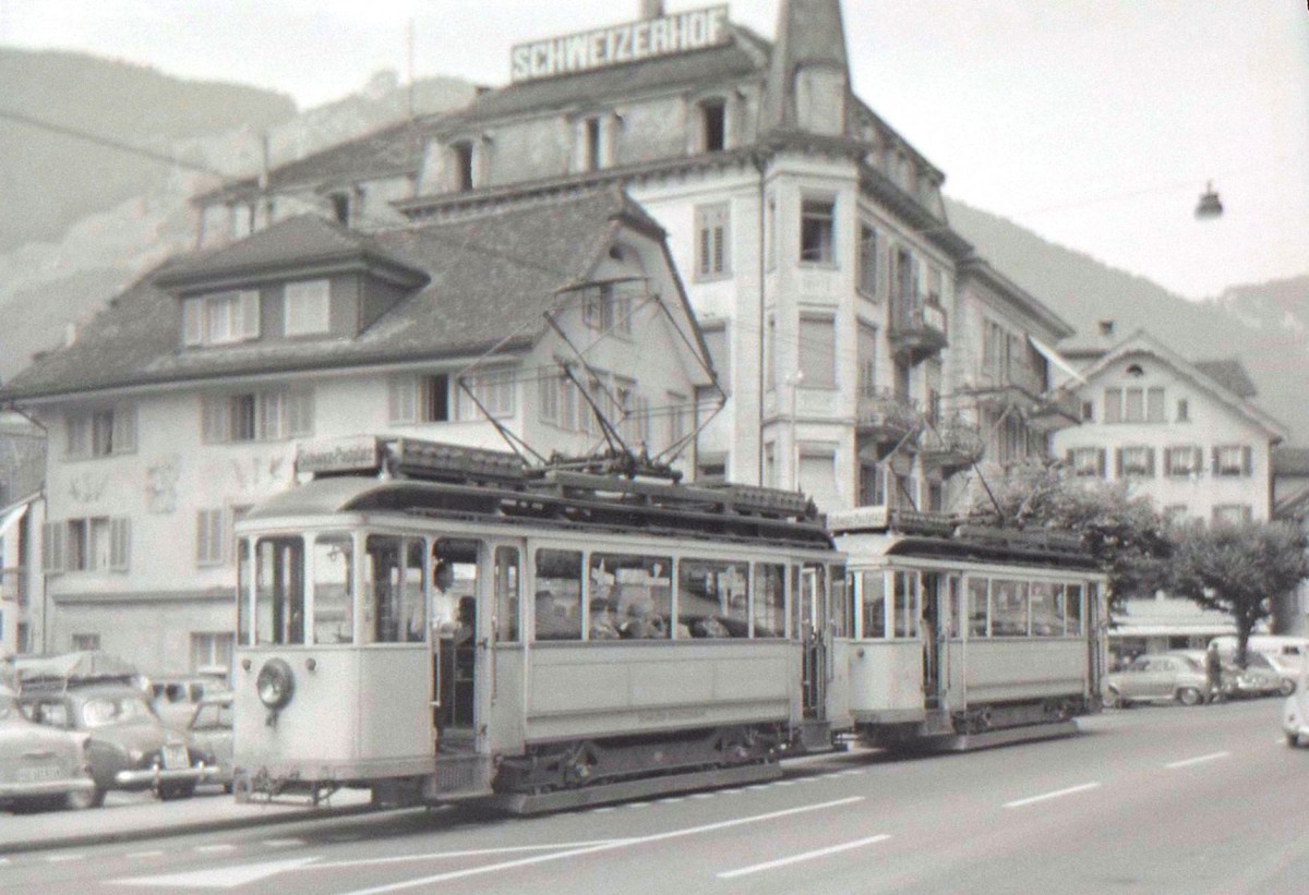 Strassenbahn Schwyz-Brunnen, Oktober 1963. Anhänger 12 am Postplatz Schwyz.