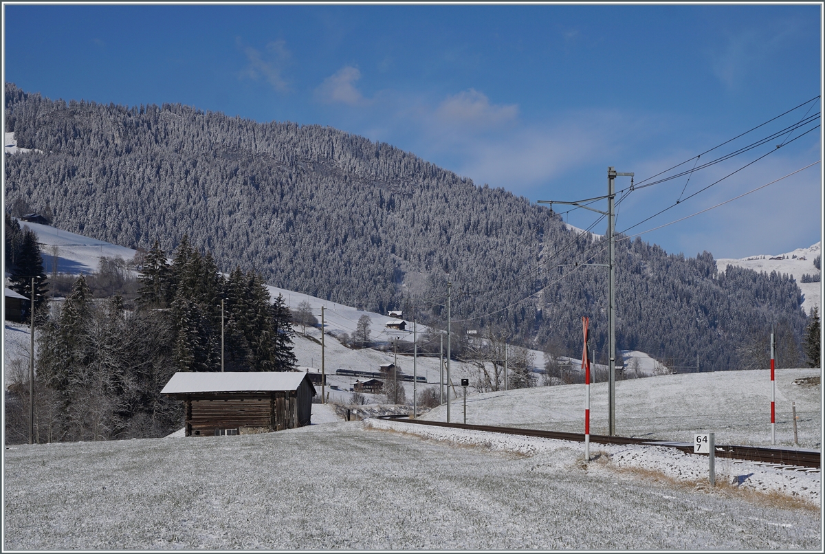 Der MOB Be 4/4 1007 (ex "Bipperlisi") ist als Regionalzug 2524 zwischen Blankenburg und Stöckli bei Kilometer 64.7 von Zweisimmen nach der Lenk unterwegs.