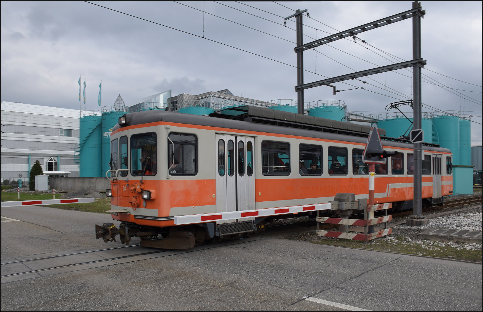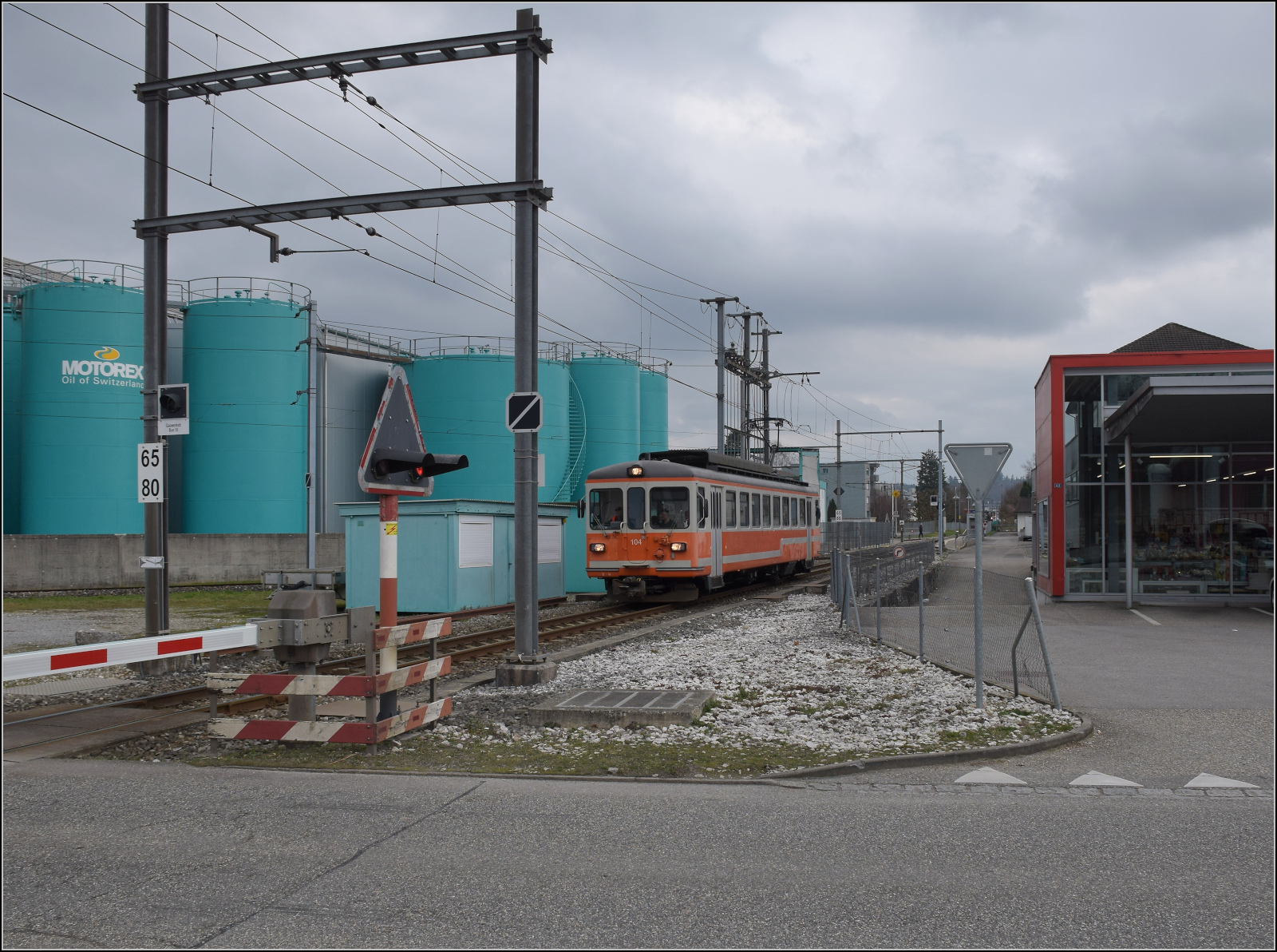 Warten auf das Bierlisi. Be 4/8 114 'Saturn' kommt von Oensingen nach Langenthal Gaswerk eingefahren. Februar 2026.