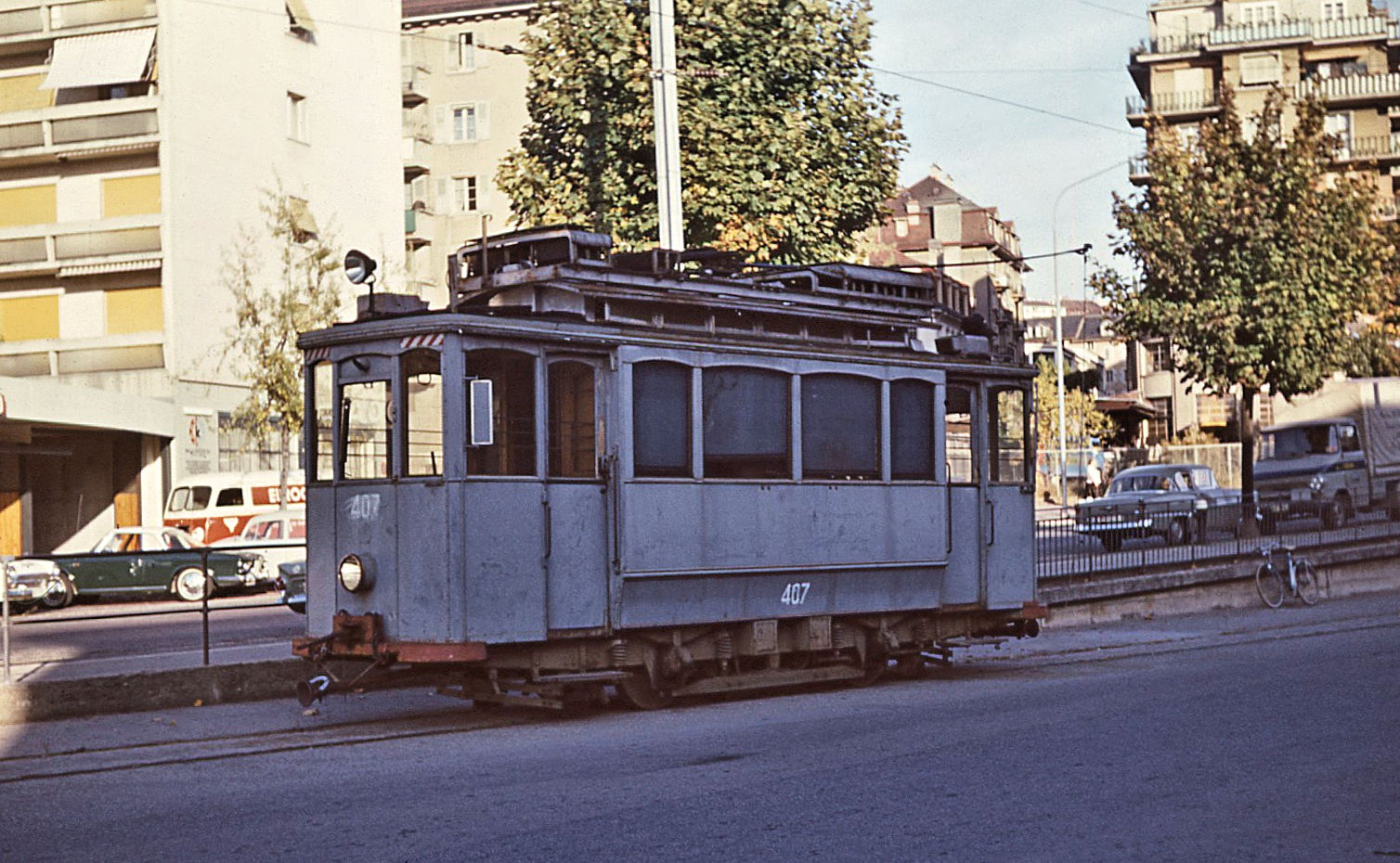 Ueberfuhr von der LEB in Lausanne Chauderon zur Umladestelle in Sébeillon: Tramwagen 762, früher Wagen 71 von 1911 der Tramway de Lausanne. Rangierarbeiten mit zwei Zuckerrübenwagen in Lausanne Sébeillon. Man beachte, dass im Gegensatz zu den anderen Dienstmotorwagen mit Trolley dieser Wagen einen Scherenbügel hat. 16. Oktober 1967