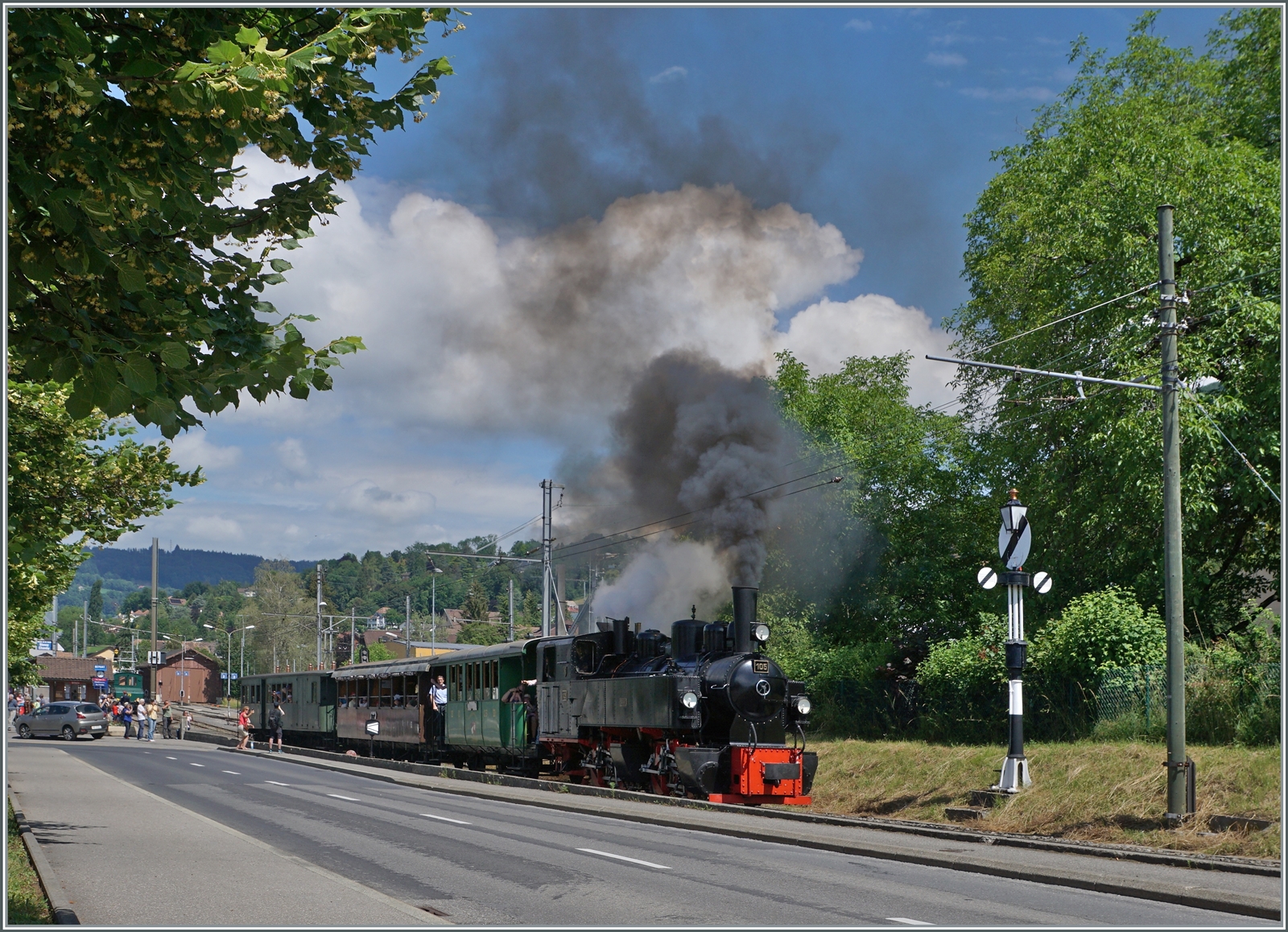 Der Blonay-Chamby Extrazug von Vevey nach Chaulin wartet in St-Légier Gare auf den Gegenzug. so dass die Lokmannschaft und die beide Dampfloks G 2x 2/2 105 und HG 3/4 N° 3 etwas verschnaufen können.
