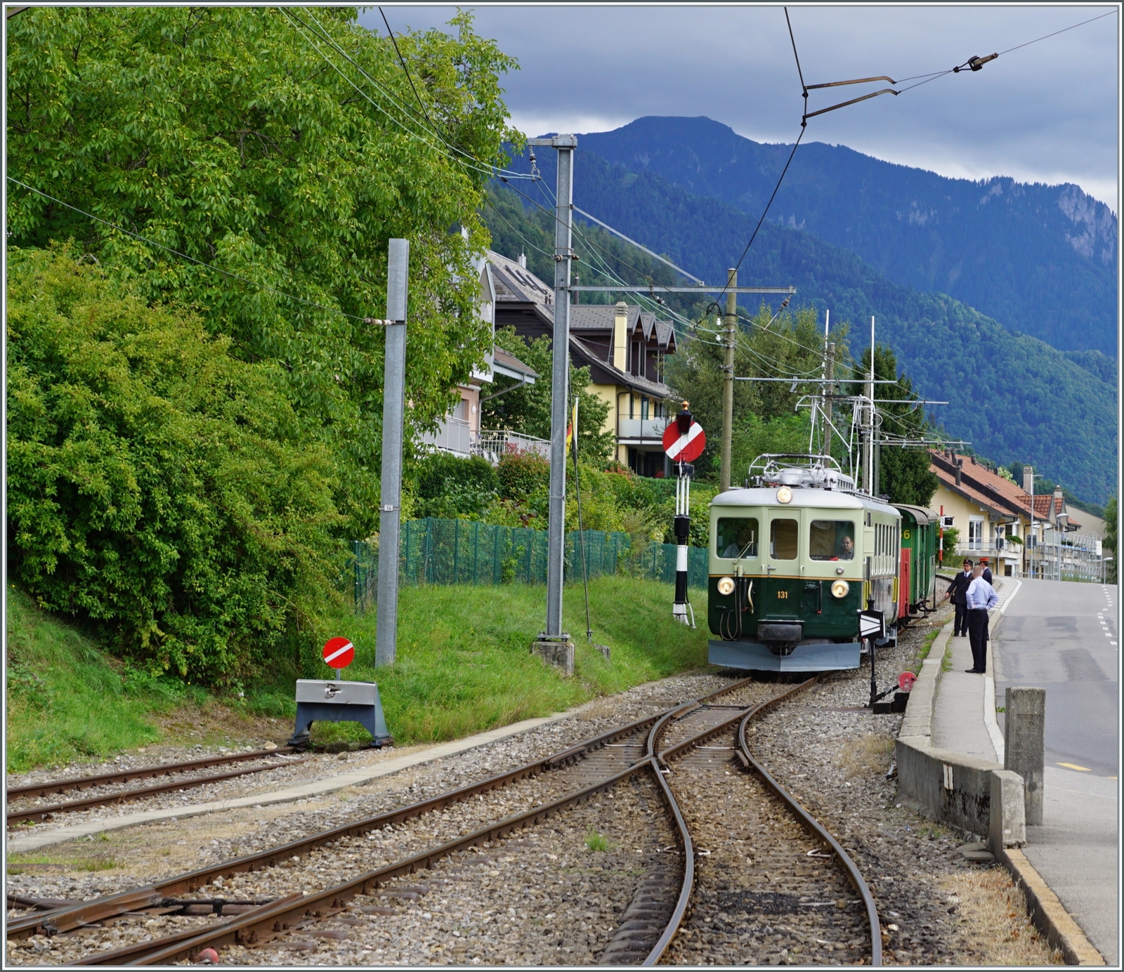Il était une fois... les années 40 / Es war einmal: die 40er Jahre: Der GFM Ce 4/4 131 von GFM Historique rangiert in Blonay, während rechts im Bild ganz neuzeitlich ein CEV MVR ABeh 2/6 nach Les Pléiades den Bahnhof verlässt.