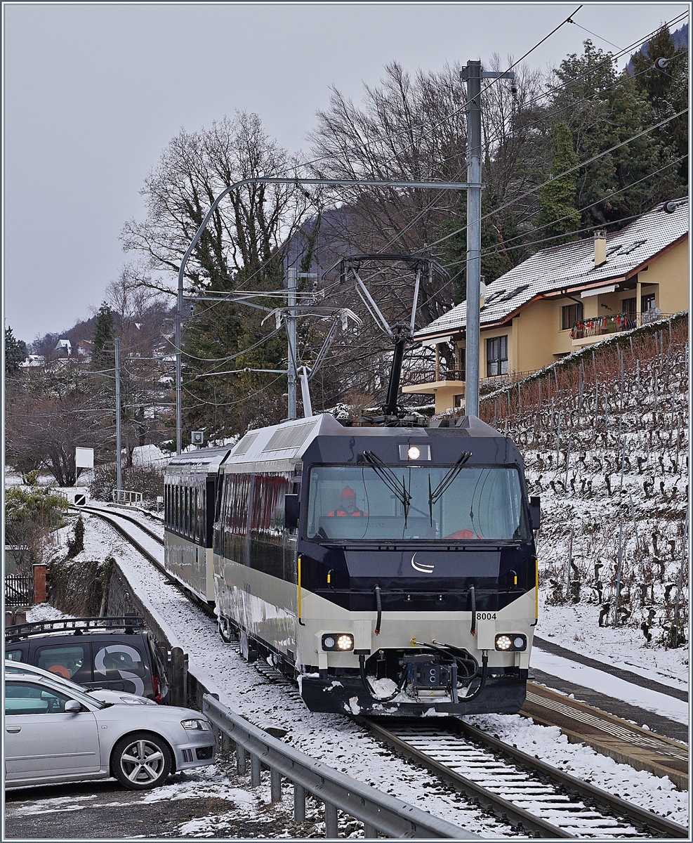 Die MOB Ge 4/4 8004 damals ganz frisch aus der Revision gekommen mit einem Dienstzug bei Planchamp. 29. Dez. 2017