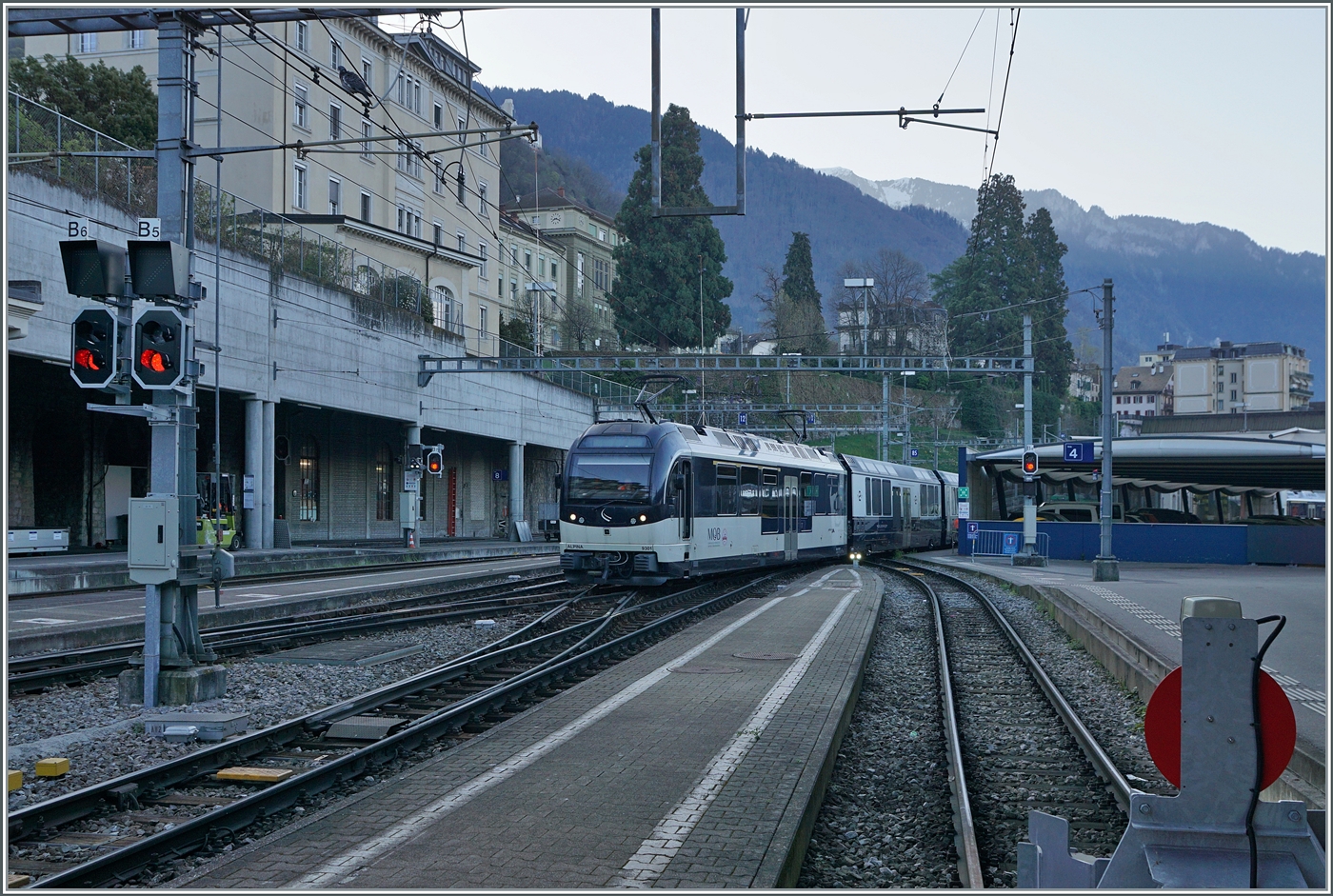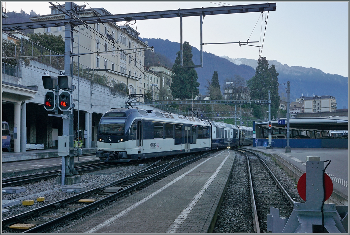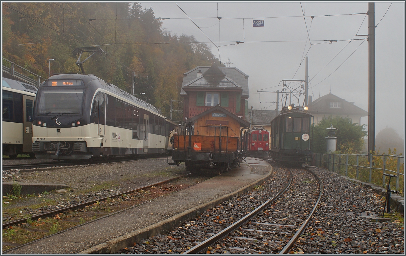 Nur zwei MOB Alpina Be 4/4 / ABe 4/4 (Serie 9000) ohne Zwischenwagen bilden den Regionalzug 2209 von Zweisimmen nach Montreux. Das Bild wurde in Montbovon aufgenommen.