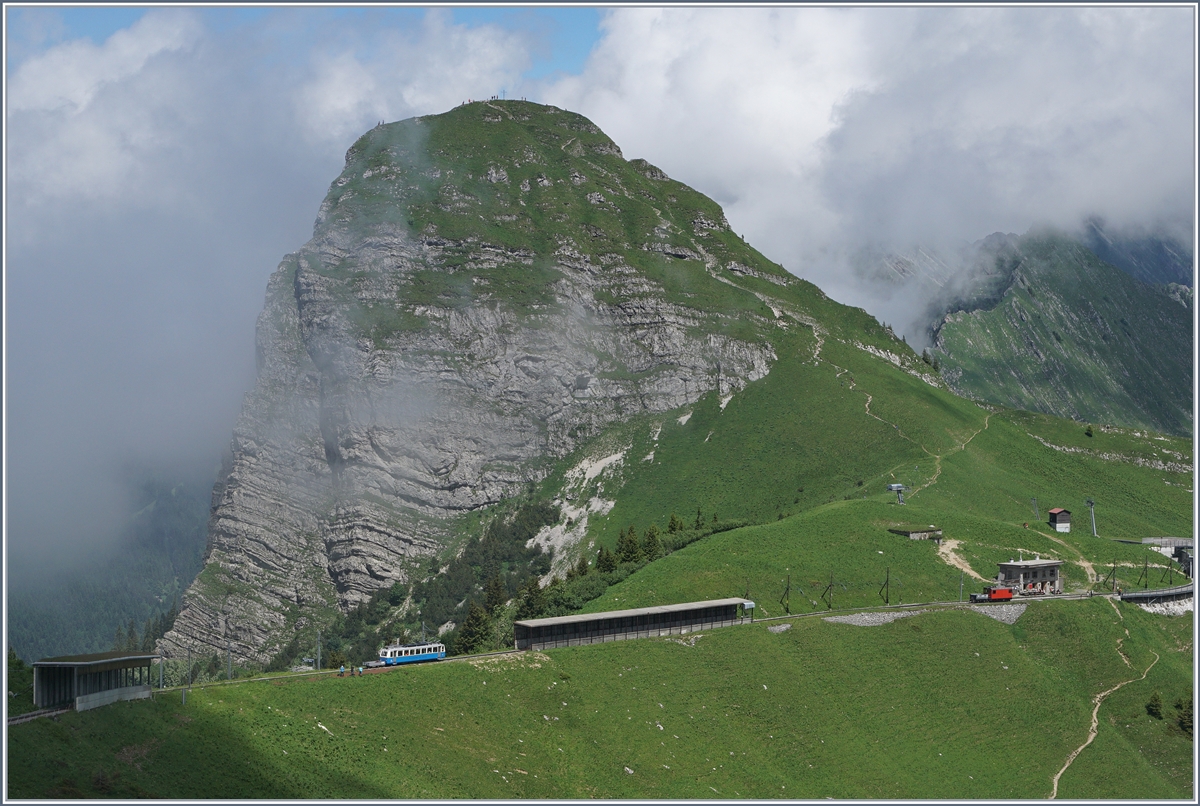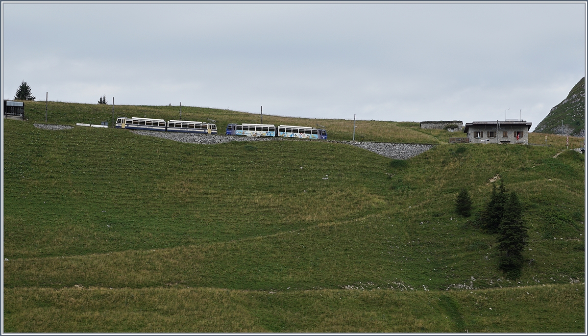 Ein talwärts fahrender Zug kreuzt in Jaman einen bergwärts fahrenden Extrazug.