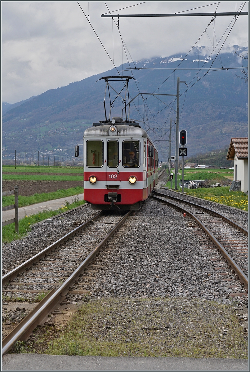 Der BLT Be 4/4 12, welcher ich vor vielen Jahren fotografiert habe, ist nun bei der AOMC im Einsatz. Er erreicht als Be 4/4 102 von Monthey kommend den Bahnhof von Villy. 7. April 2016