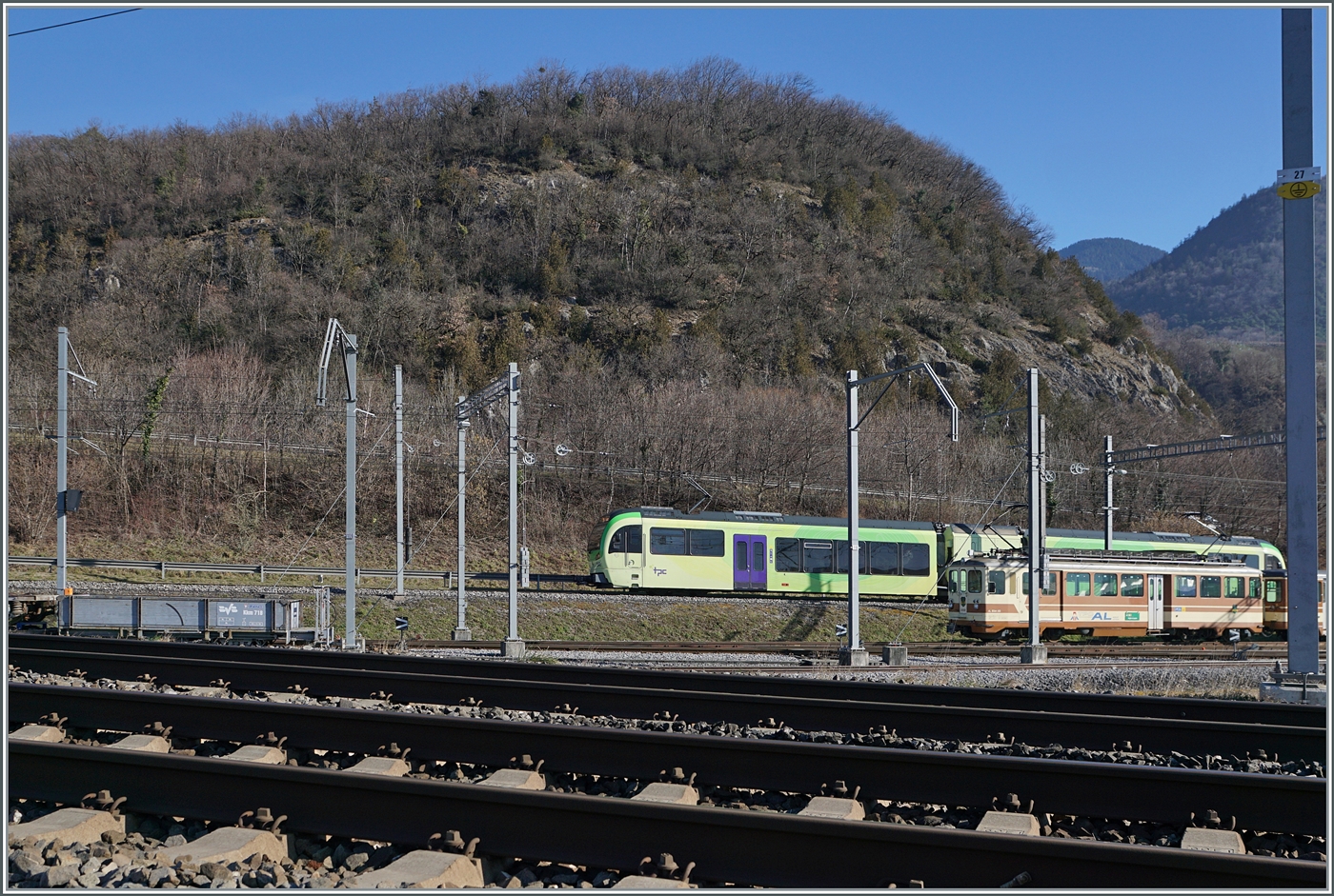 Von Aigle her führt die Strecke der AOMC (heute TPC) eine guten Kilometer lang der SBB Simplonstrecke und wendet sich das gegen Osten, wo vor einigen Jahren des TPC Dépôt entstand. Im Bild der TPC Beh 2/6 541 auf dem Weg in Richtung Monthey. 4. Feb. 2024