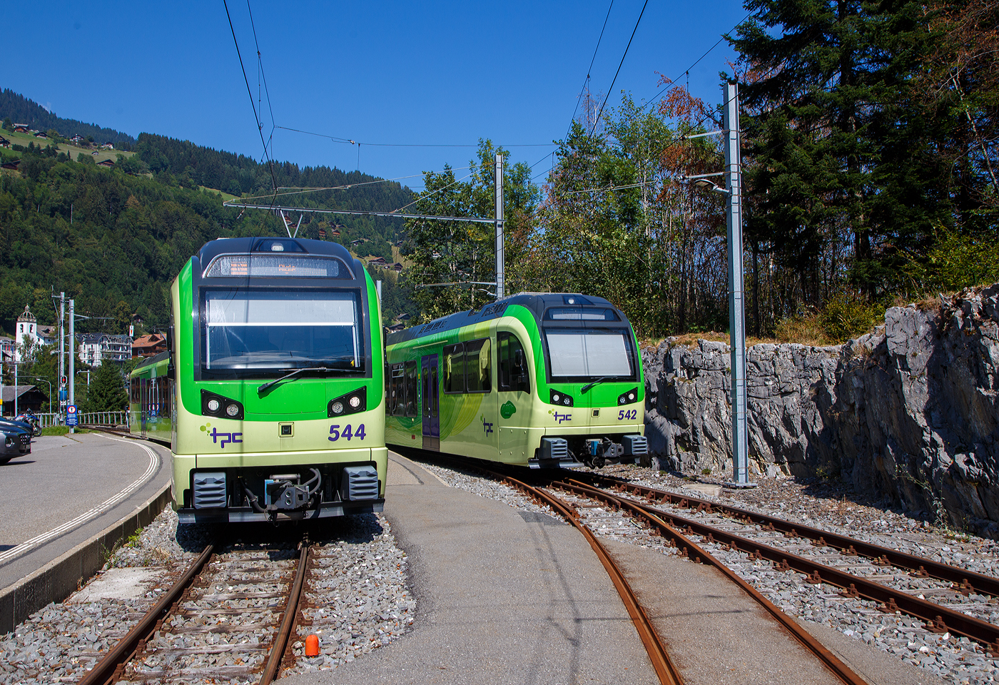 Zwei tpc AOMC/ASD Beh 2/6 meterspurige Triebzüge mit gemischtem Adhäsions- und Zahnradbetrieb vom Typ Stadler SURF stehen am 08 September 2023 im Endbahnhof der AOMC in Champéry (1.037 m ü. M.). Links der Triebzug 544 und rechts 542. SURF steht für Série Unifiée Romande pour Réseau Ferré métrique (Einheitliche Serie für das Westschweizer Meterspurige Schienennetz). Die AOMC (Chemin de fer Aigle–Ollon–Monthey–Champéry, deutsch Aigle-Ollon-Monthey-Champéry-Bahn, war eine Eisenbahngesellschaft in den Schweizer Kantonen Waadt und Wallis. Sie entstand 1946 aus der Fusion der 1907 eröffneten Chemin de fer électrique Aigle–Ollon–Monthey (AOM) mit der 1909 eröffneten Chemin de fer Monthey–Champéry–Morgins (MCM) und fusionierte 1999 zu den Transports Publics du Chablais (TPC). Die 23,4 Kilometer lange Strecke der verbindet Aigle durch das Rhonetal mit Monthey (reine Adhäsionsbahn) und führt anschließend als Bahn mit gemischtem Adhäsions- und Zahnradbetrieb nach Champéry im Val d’Illiez. Oben direkt neben dem Endbahnhof Champéry befindet sich die Talstation der Luftseilbahn Champéry-Croix de Culet (Planachaux). Im Sommer 2016 wurde die Strecke umfassend modernisiert. Dabei wurden die Zahnstangenabschnitte vollständig erneuert und das bisherige Zahnstangensystem Strub durch Abt-Zahnstangen ersetzt. Weiter wurde die Fahrleitungsspannung von 950 auf 1500 V erhöht. Somit besitzen alle ab Aigle verkehrenden Strecken der TPC das gleiche Zahnstangensystem und die gleiche Spannung. Der Verkehr wird nun vollständig mit den neu abgelieferten Beh 2/6 541–547 abgewickelt. Von den bestehenden Triebfahrzeugen der AOMC wurden einzig die beiden im Jahr 2001 gelieferten Doppeltriebwagen Beh 4/8 591–592 an das neue Zahnstangen- und Stromsystem angepasst.