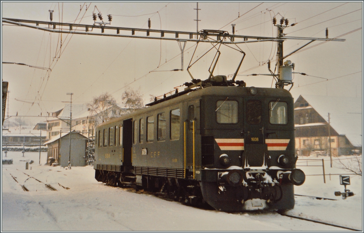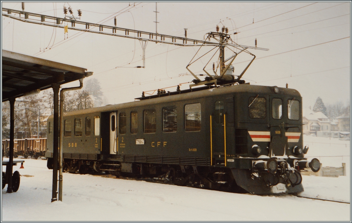 Zur Linie nach St.Gingolph: Am 9.Januar 1981 hob sich an der Endstation St.Gingolph der alte Triebwagen Be 4/6 1614 schön gegen die Schneeberge ab. Leider stört das Fahrverbotsschild davor.