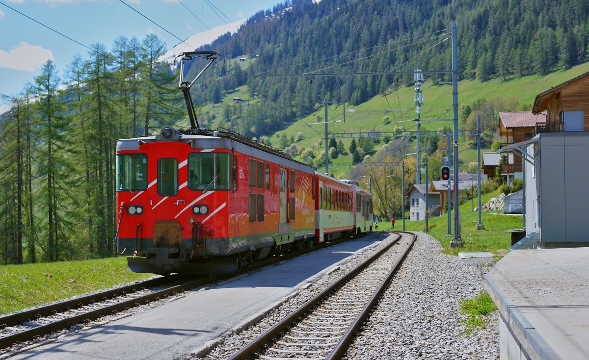 Während die MGB Gm 4/4 61 im DFB Bahnhof von Oberwald rangiert, fährt im MGB Bahnhof ein Regionalzug Richtung Andermatt aus..