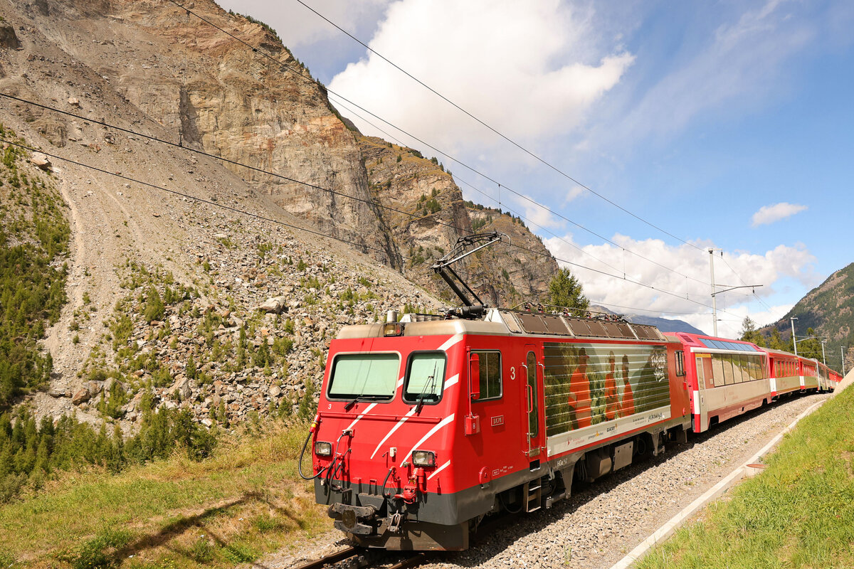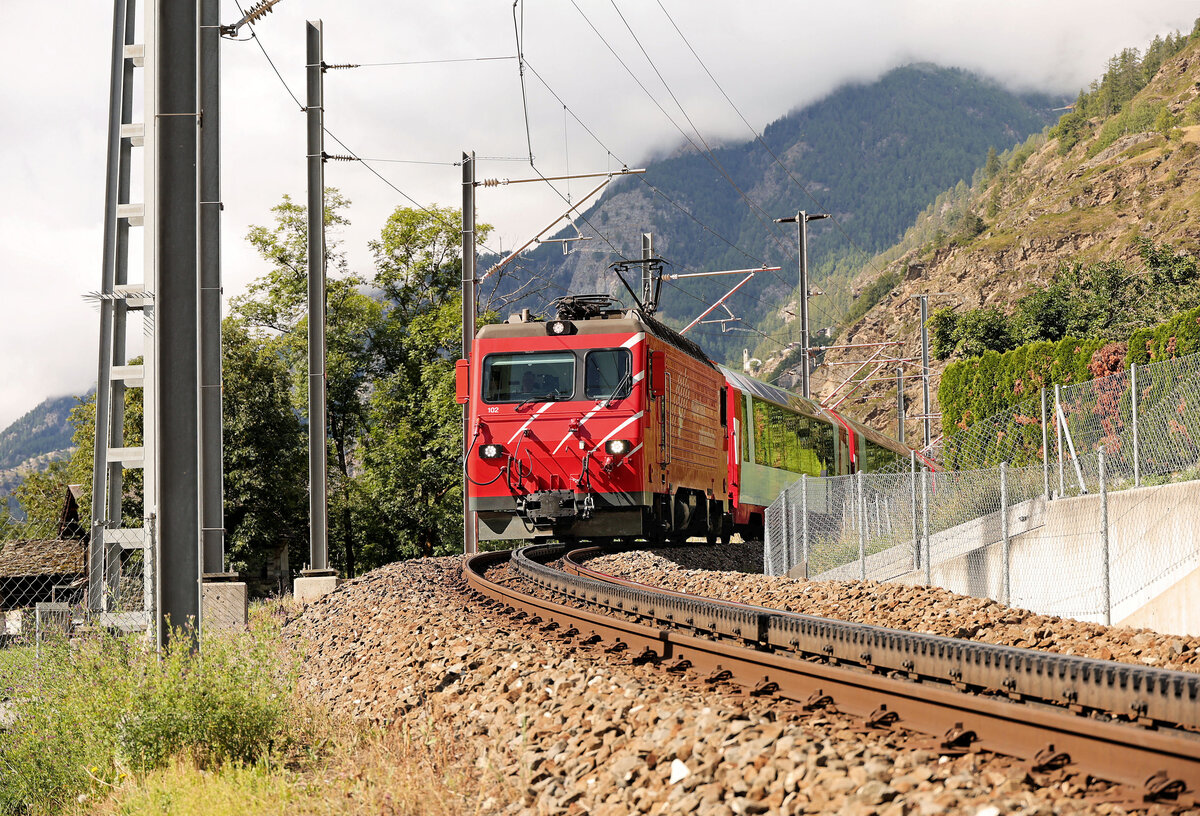 In Disentis hat die MGB HGe 4/4 II N° 4 die im Bild rechts zu sehende RhB Ge 4/4 II 629 vor dem Glacier Express abgelöst und wartet nun auf die Abfahrt in Richtung Zermatt.