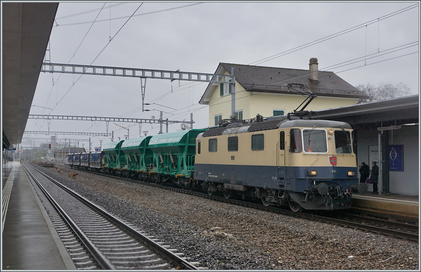 Die beiden BAM MBC Ge 4/4 21 und 22 rangieren in Morges ihren Kieszug, während ein SBB RABe 523 Morges in Richtung Allaman verlässt.