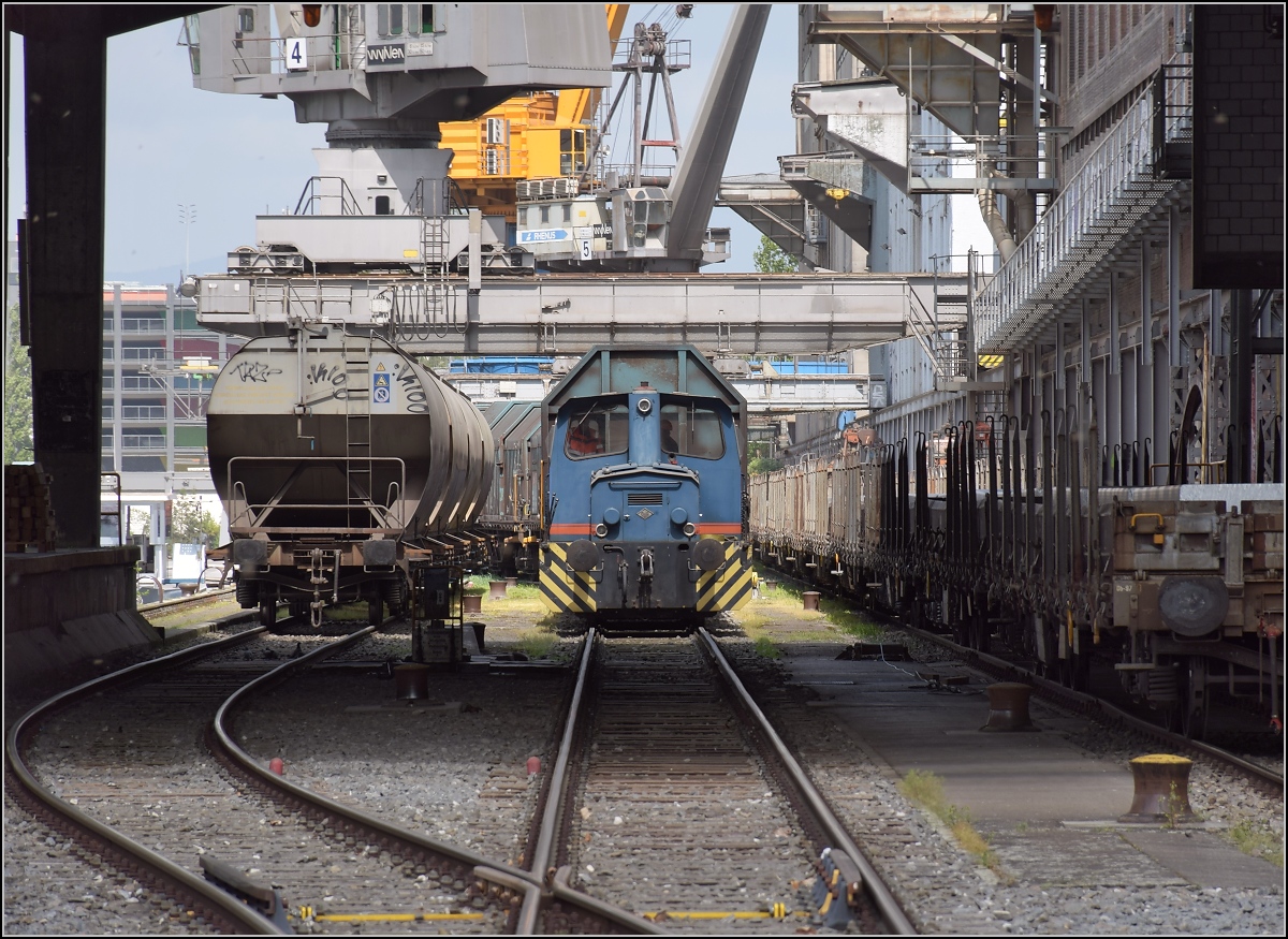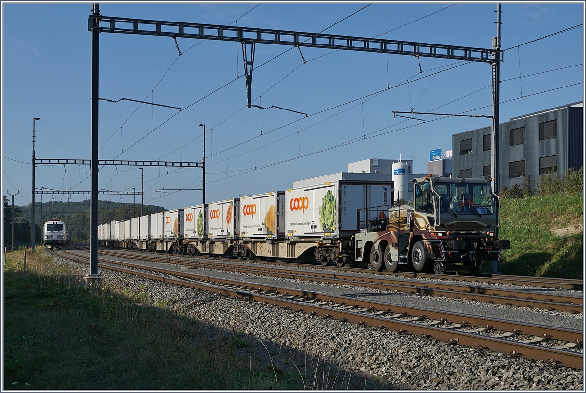 Die Rail Care Rem 476 453-6 VAUD (UIC 91 85 4476 43-6 CH-RLC) hat ihren Coop Zug von Genève la Praille nach Vufflens la Ville gebracht, gleichzeitig brachte eine gut getarnte "Rangierlok" die Fracht für die Rückfahrt nach Genève La Praille vom Werk zum Bahnhof.