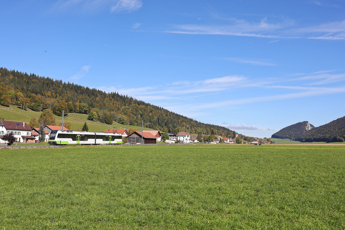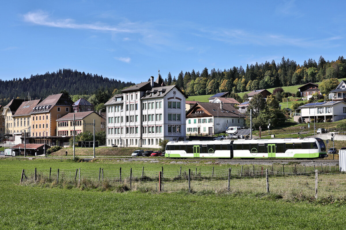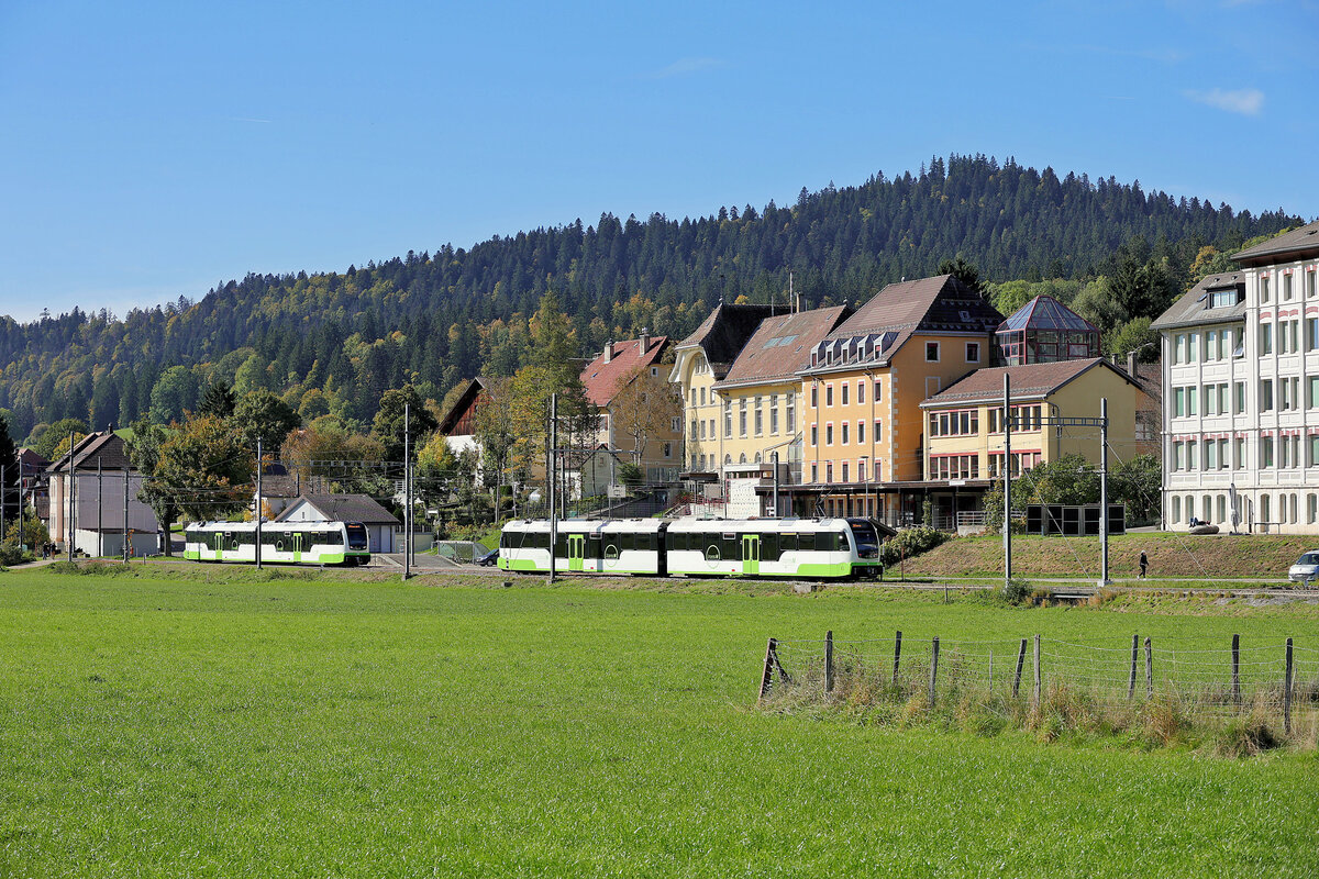 ... die wohl berühmteste Kreuzung der Schweiz: Nur einmal pro (Werk) Tag kreuzen sich in La Sagne die Züge von Les Ponts de Martel nach La Chaux de Fonds und jener aus der Gegenrichtung. Das Bild zeigt die neuen ABe 4/8 9 und 10 in La Sagne bei der Kreuzung. 28. Okt. 2024