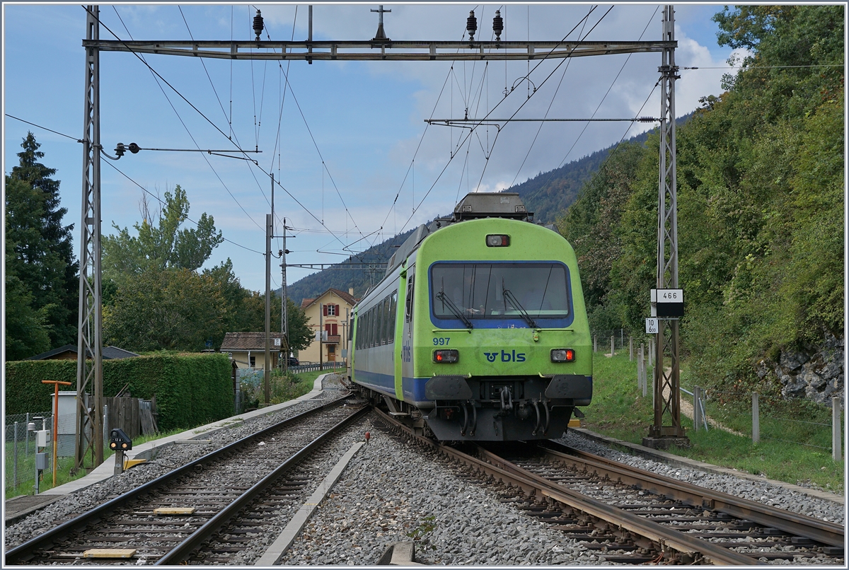 Der BLS RE 3913 von La Chaux-de-Fonds nach Bern wechselt in Chambrelien die Fahrtrichtung und wird nun mit dem "Kambly" EW III Steurwagen N° 990 an der Spitze Richtung Neuchâtel fahren.