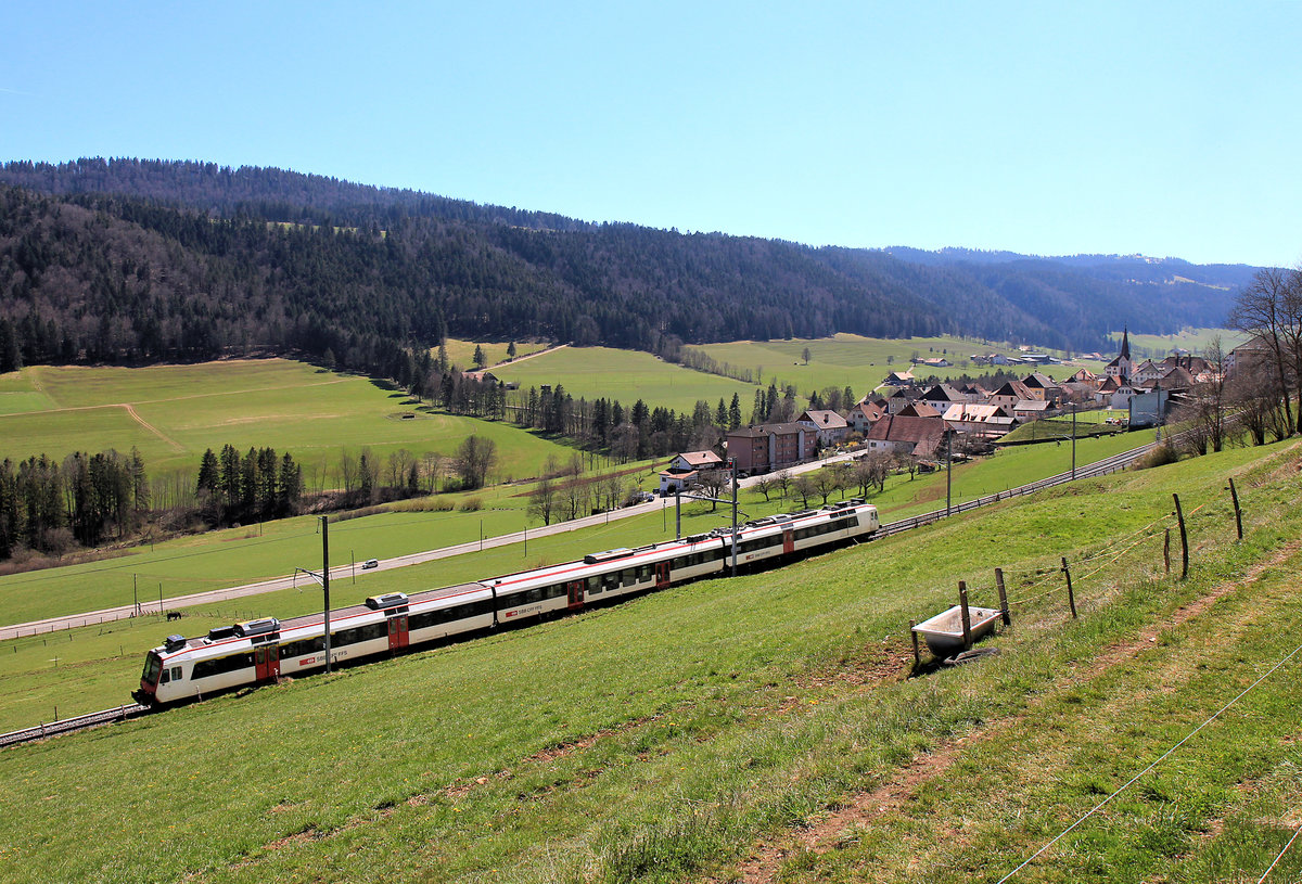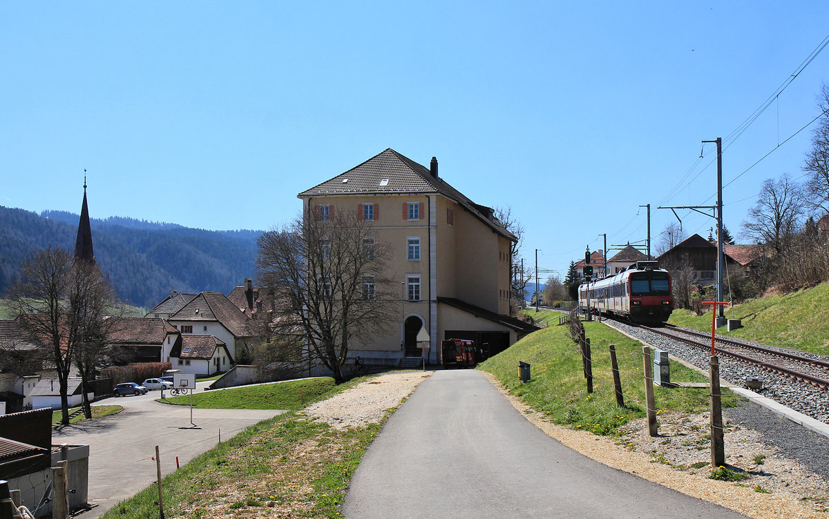 Renan (Kanton Bern). Ausfahrt eines NPZ Domino-Zugs aus dem obersten Städtchen im Tal mit seinen markanten kubischen Häusern, Mietshäuser aus dem 19.Jahrhundert, als die Uhrenindustrie hier zentral wurde. 23.April 2021