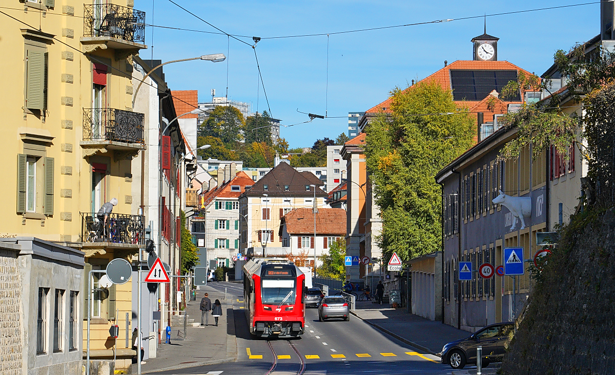 Bildausschnitt mit dem ABe 4/12 673 am 10.10.2025 in der Rue de Manege in La-Chaux-de Fonds