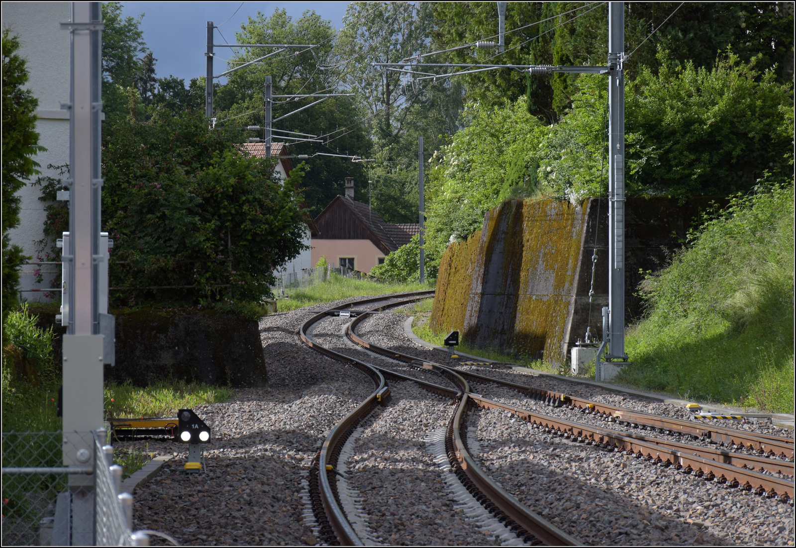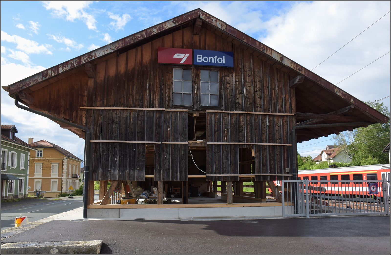Im Bahnhof von Bonfol steht auf dem Gleis zur Deponie, ursprünglich führte es nach Frankreich, der NPZ-Prototyp RBDe 566 221. Februar 2022.