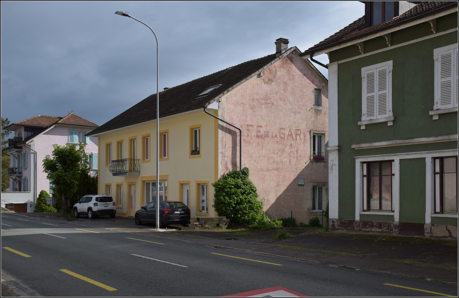 Das Empfangsgebäude von Bonfol ist im Gegensatz zu den Gleisen ein wenig heruntergekommen. Für einen Grenzbahnhof wenig repräsentativ, aber für das Dorf überdimensional. Französische Züge fuhren einst bis hierher zur Grenzkontrolle. Mai 2024.