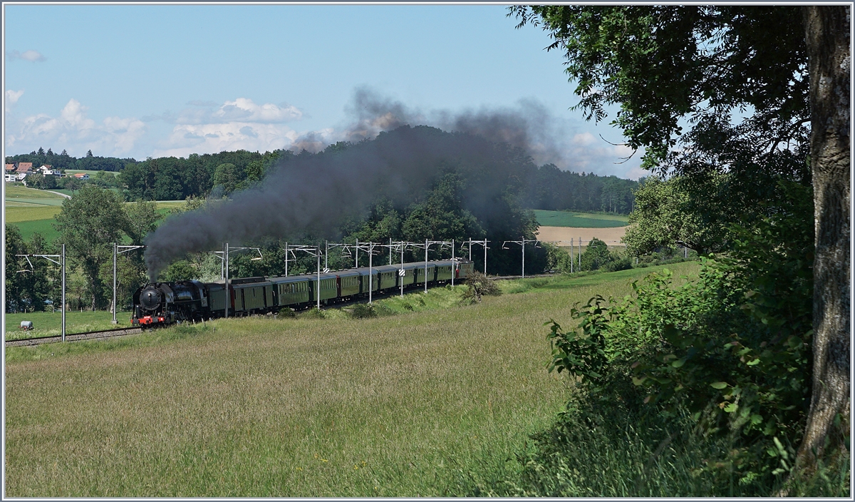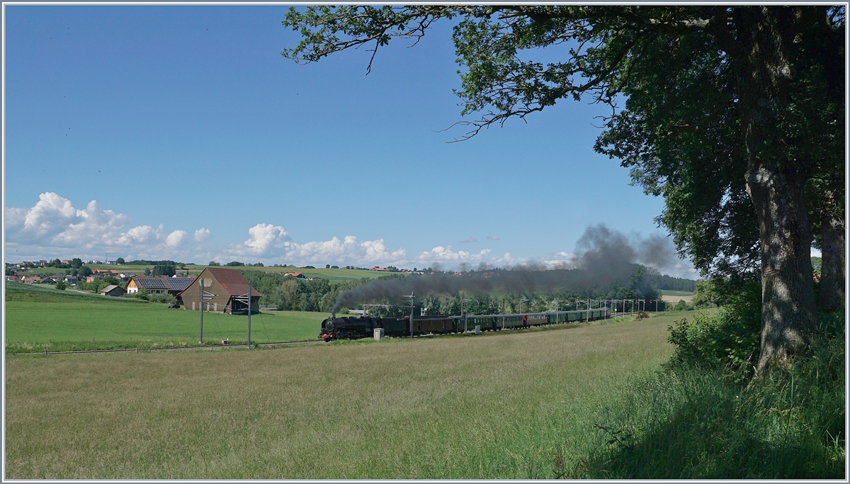 Die SNCF 141 R 568 mit ihrem Extrazug kurz vor Chénens. Die SNCF 141 R 568 ist mit ihrem Zuf auf der Rundfahrt von Vallorbe über Payerne, Bern und Lausanne. Die Lok mit der Achsfolge 1-D-1 wurde 1945 von Baldwin gebaut, ist 187.5 Tonnen schwer und 100 km/h schnell. Bei der SNCF war die Lok im Dépôt Belfort beheimatet. Heute kümmert sich die "Association 141R568" um die Lok.