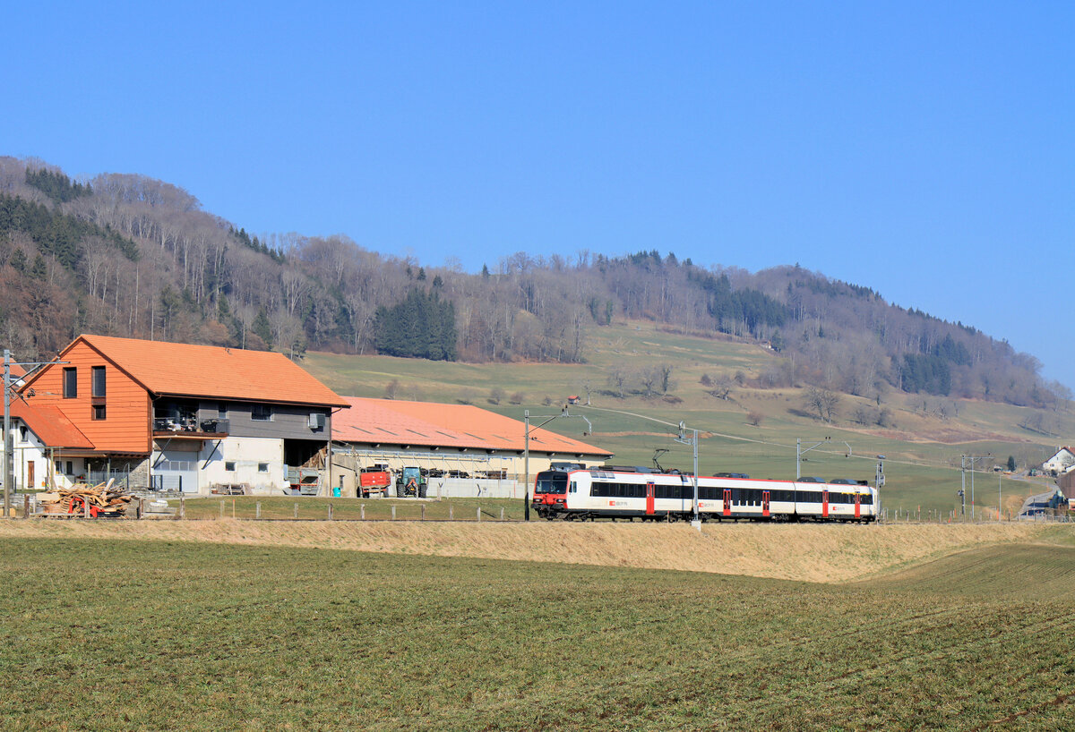 Der Palézieux von der "Hauptstrecke" Lausanne - Bern abgezweigte SBB Domino ist auf dem Weg ins Broyetal und erreicht den Halt Palézieux Village.