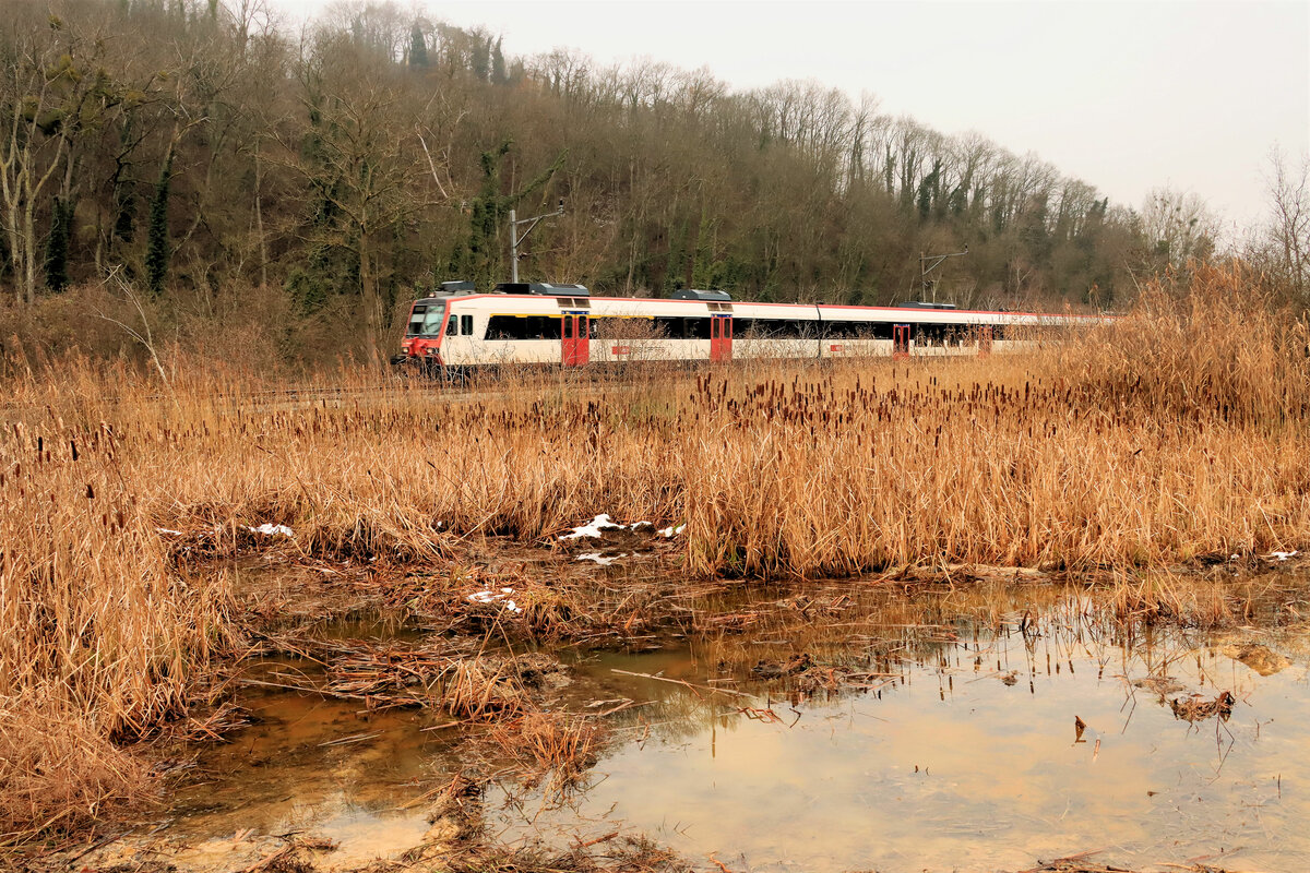 Im Naturschutzgebiet der Grande Cariçaie. Triebwagen 560 259 auf der Fahrt Richtung Estavayer-le-Lac. 14.Dezember 2021
