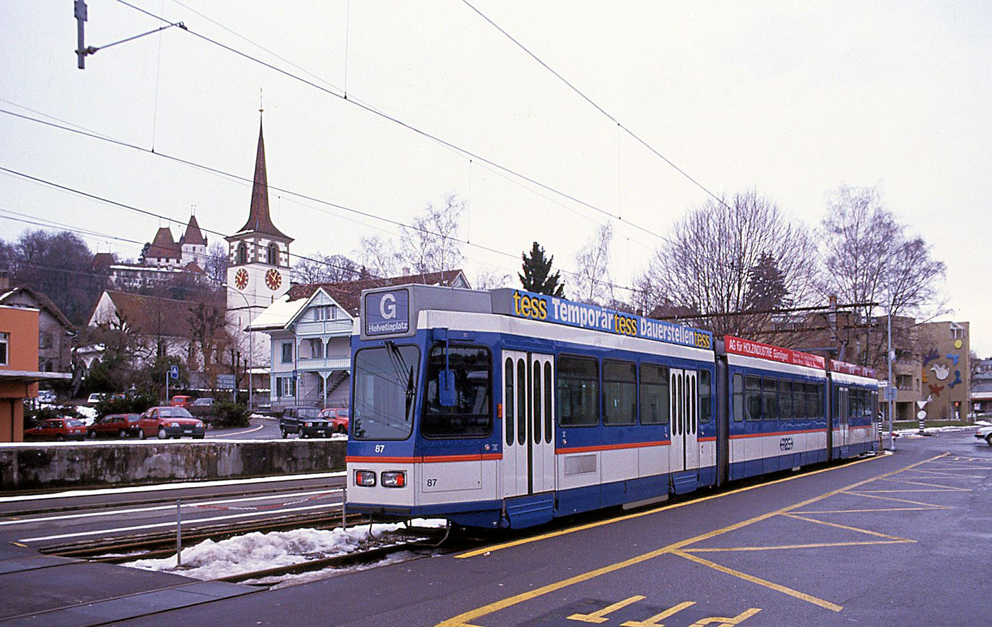 Auf der Suche nach einem "Mandarinli" bin ich - bildlich gesprochen - über dieses "blaue Bähnli" gestolpert: In Worb Dorf wartet der VBW BDe 4/4 N° 35, mit einen Zwischen- und Steuerwagen auf die Abfahrt nach Bern Kirchenfeld. Interessanterweise ist das so typisch urige "Blaue Bähnli" in diesem Fall gar nicht so sehr schweizerisch, stammen doch Zwischen- und Steuerwagen aus Rastatt, bzw. waren vor der Übernahme an die VBW in Pforzheim im Einsatz. Der ex Zwischenwagen 338 erhielt vom VBW BDt3 241 die Führerstands Einrichtung und ist nun als Steuerwagen 233 unterwegs.