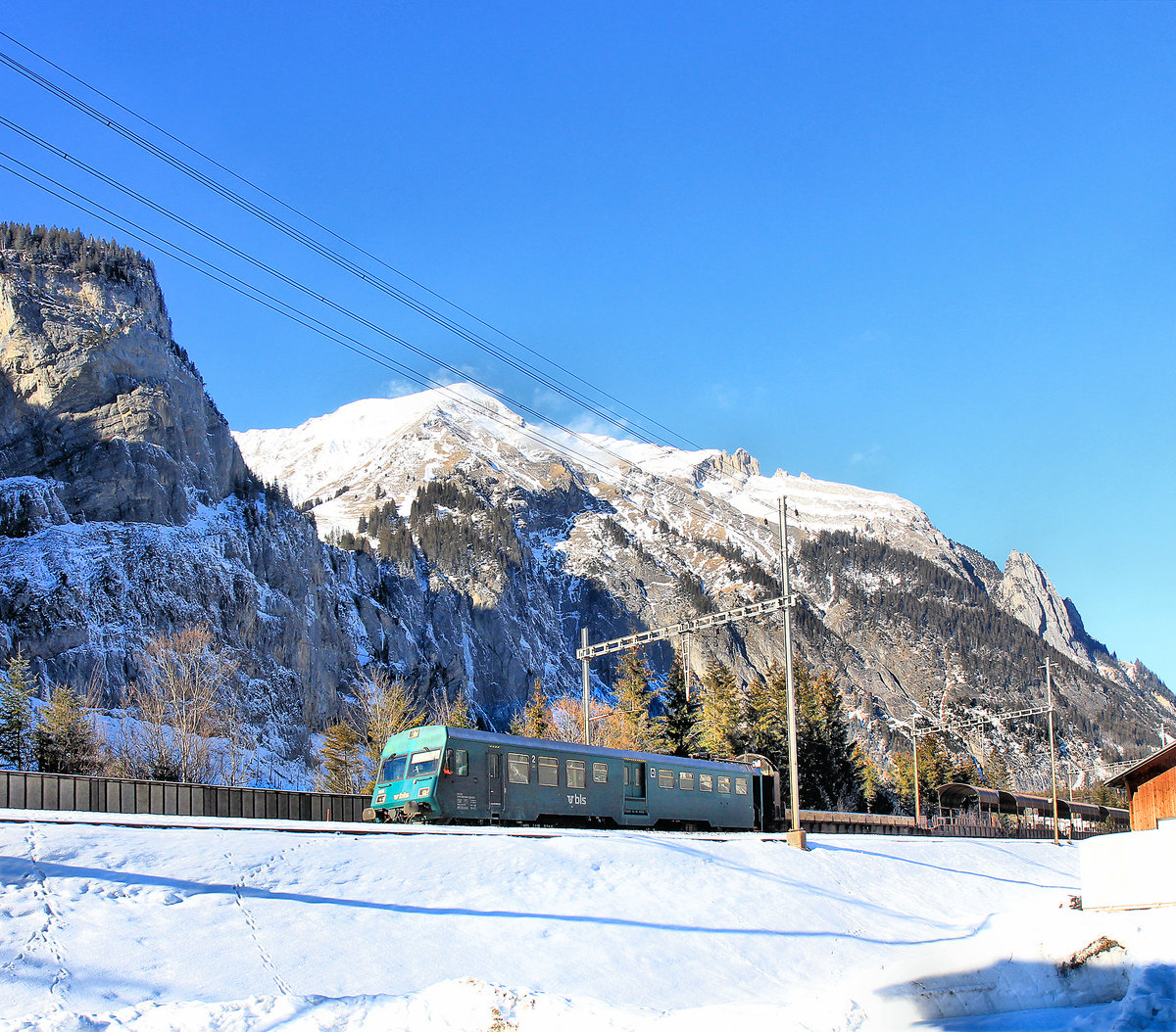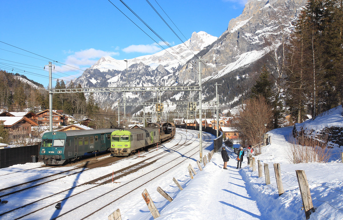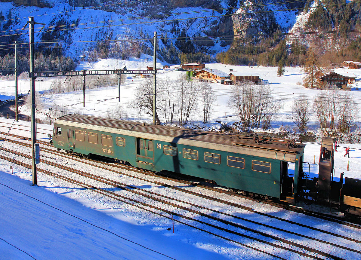Steuerwagen der Autozüge durch den Lötschberg-Scheiteltunnel: Während in Goppenstein die Alpen schneeweiss im Sonnenlicht strahlen, verzieht sich im Dunkeln der Steuerwagen BDt 50 85 80-35 957 (Serie 956-959 von 1991) in den Lötschbergtunnel. 7.Januar 2021