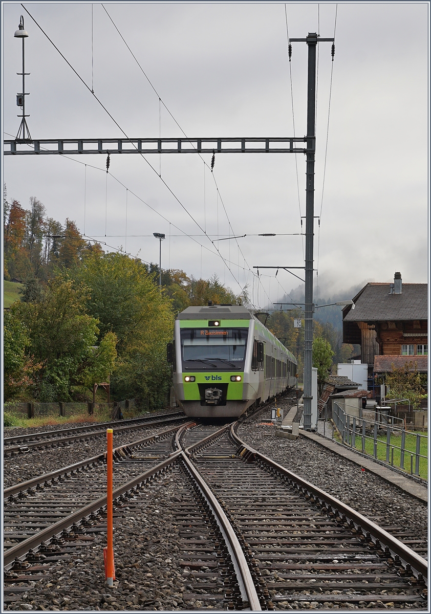 Die BLS Re 4/4 II 501 wartet mit ihrem EW III RE von Interlaken Ost nach Zweisimmen in Boltigen auf den Gegenzug.