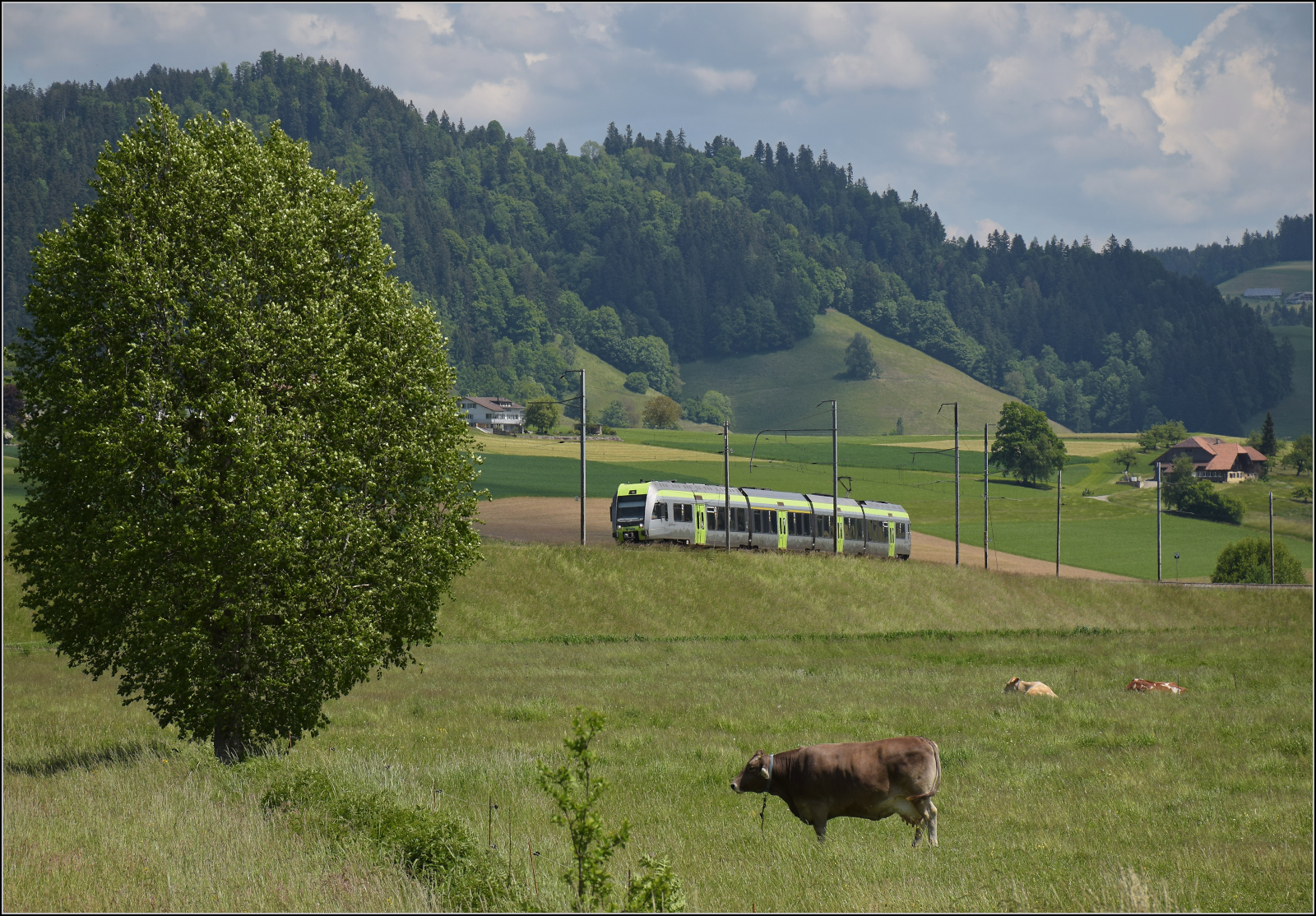 Frosch und Wildsau der CJ sind auf diesem Zug längst wieder verschwunden, der Emmentaler RBDe 566 222 ist wieder daheim und strahlt im RM-Rot. Hier kommt er die Rampe von Großhöchstetten (im Hintergrund) nach Konolfingen runtergefahren, während im Vordergrund die Herdenchefin die gesamte Umgebung äusserst aufmerksam im Blick behält. Konolfingen Dorf, Mai 2025.