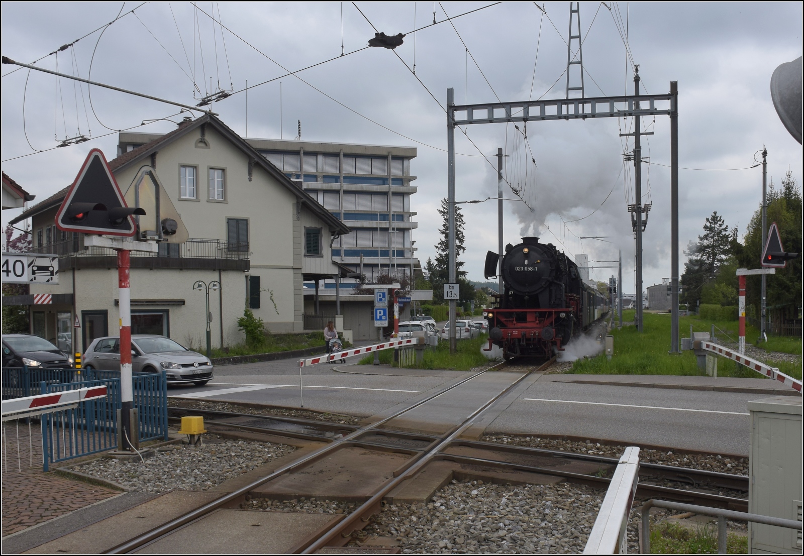 Nachdem der Zug der Suhrentalbahn gerkreuzt hat, erreicht 23 058 mit hoher Geschwindigkeit die Schienenkreuzung der Nationalbahn mit der Suhrentalbahn in Oberentfelden. April 2023.