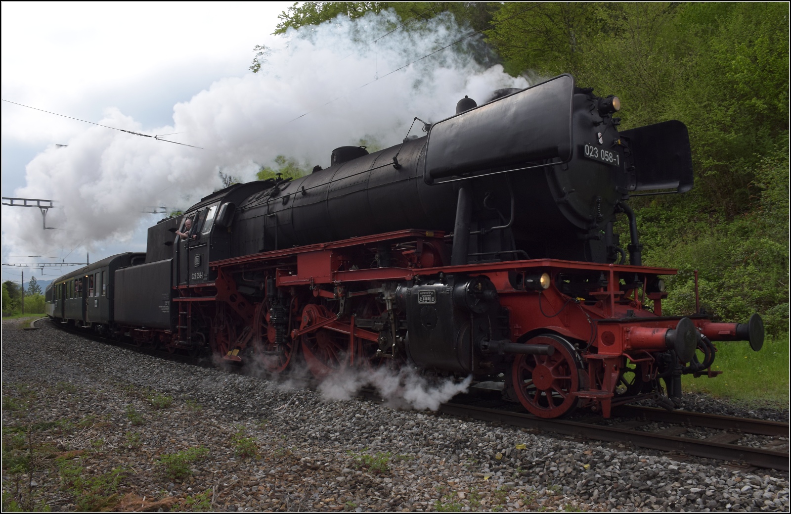In der Steigung zum ehemaligen Bahnof Baden Oberstadt bietet sich mit der spektakuläre Durchfahrt von 23 058 ein geeigneter Einstieg in die Verfolgung des Sonderzuges. April 2023.