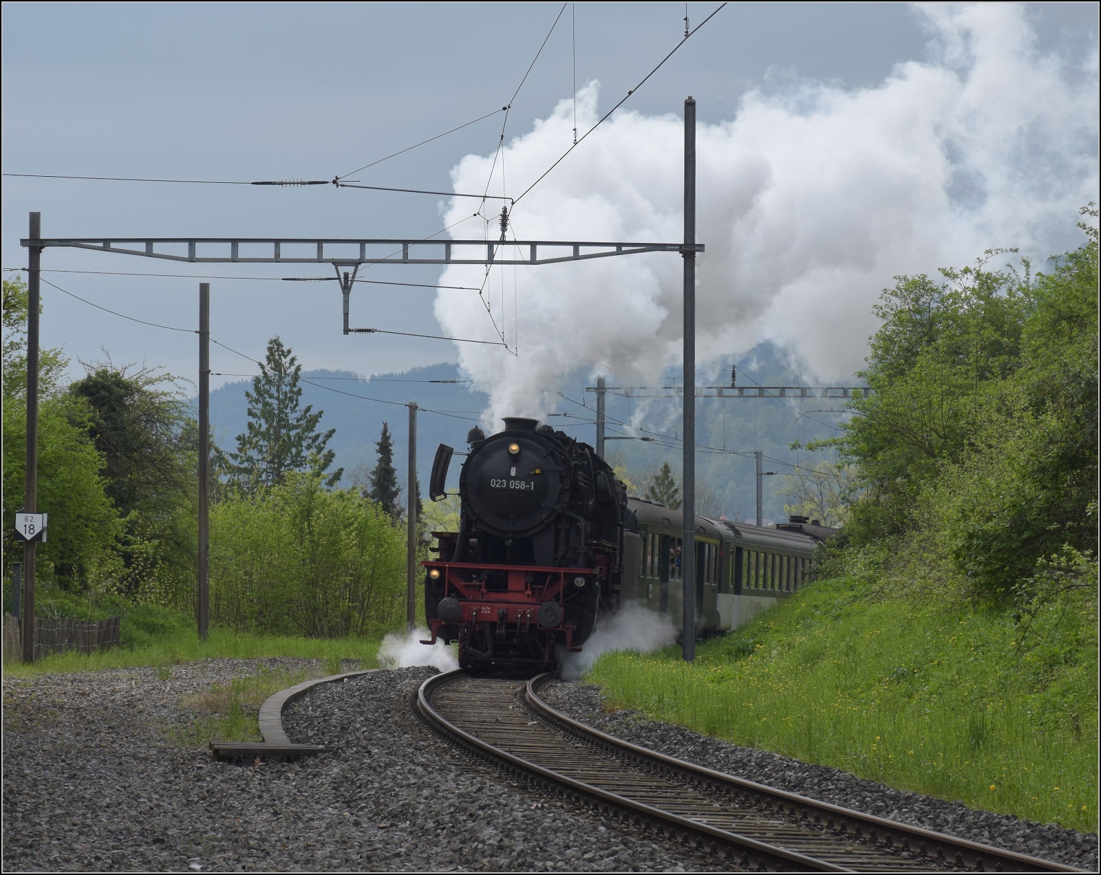 Rundfahrt vom Bodensee durchs Emmental mit 23 058 und Ae 4/7 11022. In der Steigung zum ehemaligen Bahnof Baden Oberstadt bietet sich mit der spektakuläre Durchfahrt von 23 058 ein geeigneter Einstieg in die Verfolgung des Sonderzuges. April 2023.