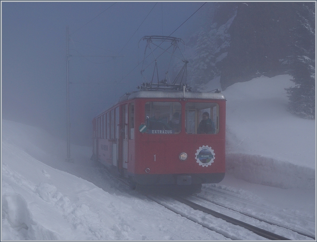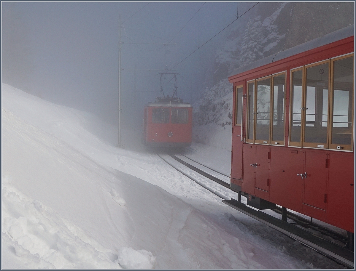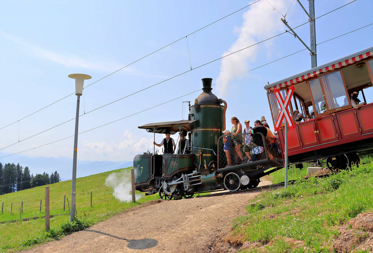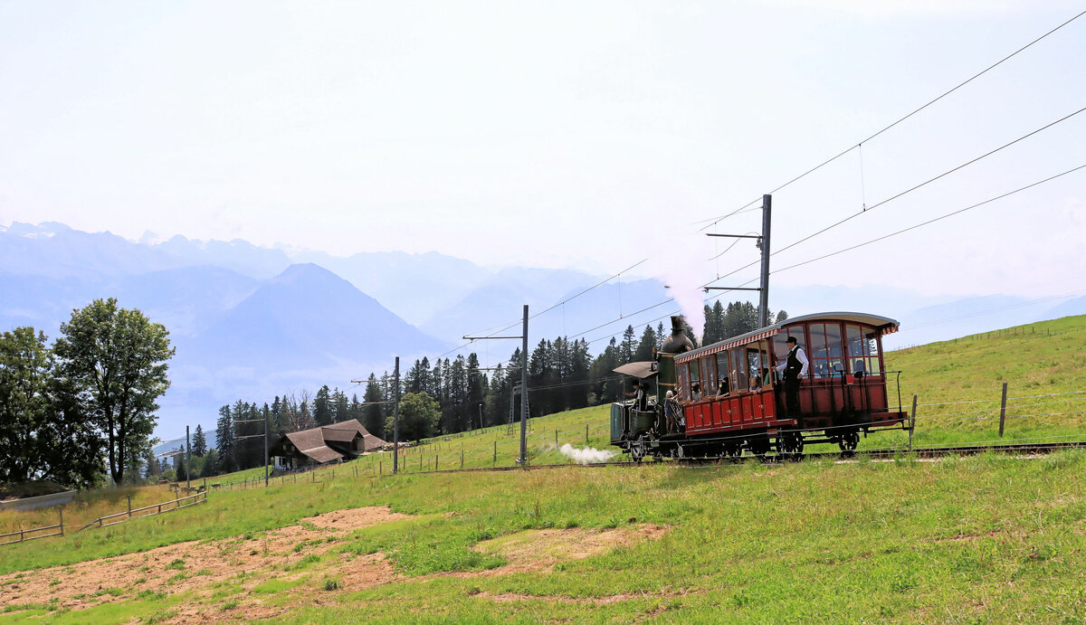Auf dem Gipfel angekommen: Der RB BDhe 2/4 N° 13, 1954 von SLM/SAAS gebaut und mit Fr. 455'918.- zu buche geschlagen. Daneben die RB H 2/3 N° 16, die von Vitznau heraufgedampft ist..