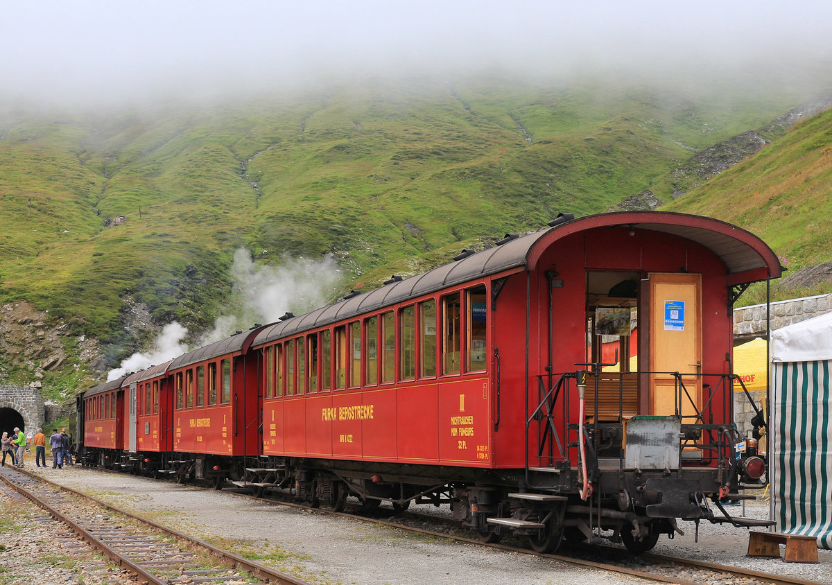 Dampfbahn Furka Bergstrecke: Die beiden Wagen BD 2503 und AB 4462, ehemals BFD C 203 und BFD AB4 53. 23.August 2020