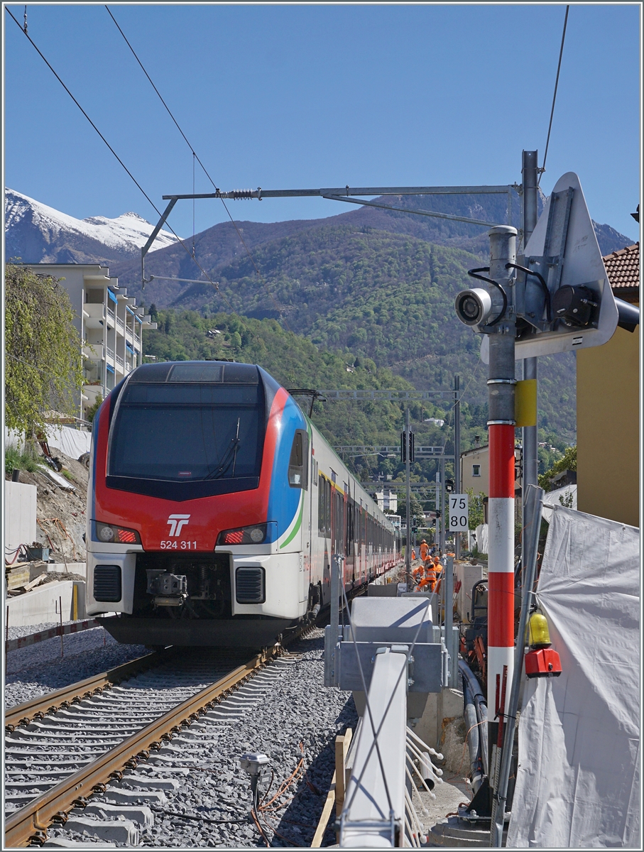 Ein SOB RABe 526 als IR auf dem Weg nach Basel SBB kurz nach der Abfahrt in Locarno. Leider konnte ich den Zug zwischen den nächsten Masten nicht mehr aufnehmen, da die Sonne in der Front so sehr spielgelte, dass sie die Kamera zu sehr irritierte.