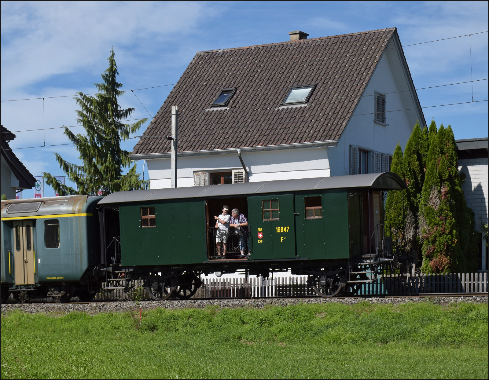 Der Museumszug mit Seetalkrokodil De 6/6 15301 mit BLS A 801 und SBB F 16847 rollt das starke Gefälle nach Hochdorf herunter. Im Bild der Einheitswagen I der BLS, A 801. September 2024.