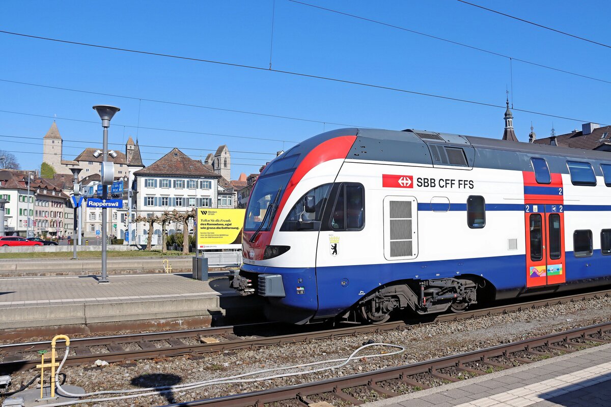 Ueber den Seedamm Rapperswil - Pfäffikon SZ: Ausfahrt des Doppelstocktriebzugs 511 001 auf den Seedamm über den Zürichsee nach Pfäffikon SZ. Der Zug ist eine Zürcher S-Bahn der Linie S5, die fast eine Ringbahn bildet: Abfahrt in Zug, dann "hinten durch" via Affoltern am Albis und Birmensdorf, dann zur Hardbrücke (Zürich), Zürich Museumsstrasse und Zürich Stadelhofen, von hier durchs Glatttal via Uster nach Rapperswil, und schliesslich über den Damm nach Pfäffikon. SZ. 5.März 2025 Peter Ackermann