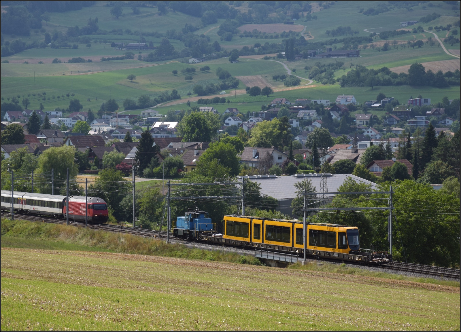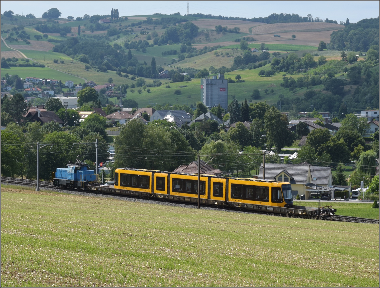 Die Stadler-Werkslok Eem 936 131 liefert eine neue TINA-Strassenbahn nach Darmstadt aus. Letztes Jahr auf der Innotrans ausgestellt, jetzt auf dem Weg zum Kunden in Frick, Juli 2023.