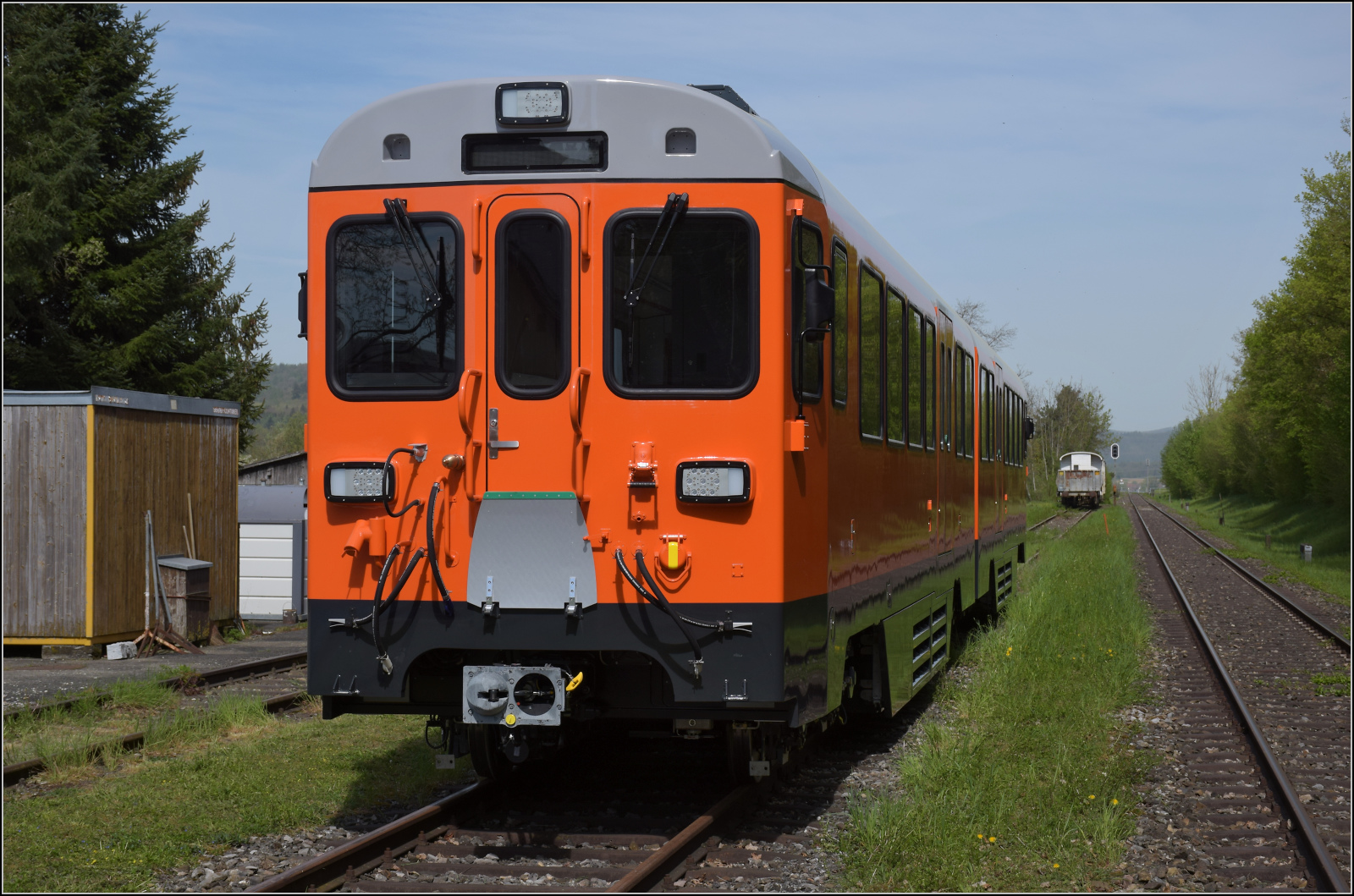 Eine gewisse Ähnlichkeit zum wunderbar aufpolierten Bernina-Triebwagen BCe 4/4 in Stefans Foto lässt sich nicht verleugnen. Das soll auch Absicht sein. http://igschieneschweiz.startbilder.de/bild/schweiz~bahnhoefe~blonay/866632/la-der-de-la-saison-.html Der für das Werksgelände von Huawei in Südchina bestimmte, nigelnagelneue Bm 880 205 in Hemishofen mit der innen per Zettel angebrachten NVR-Nummer 99 85 8880 205-6. April 2024.