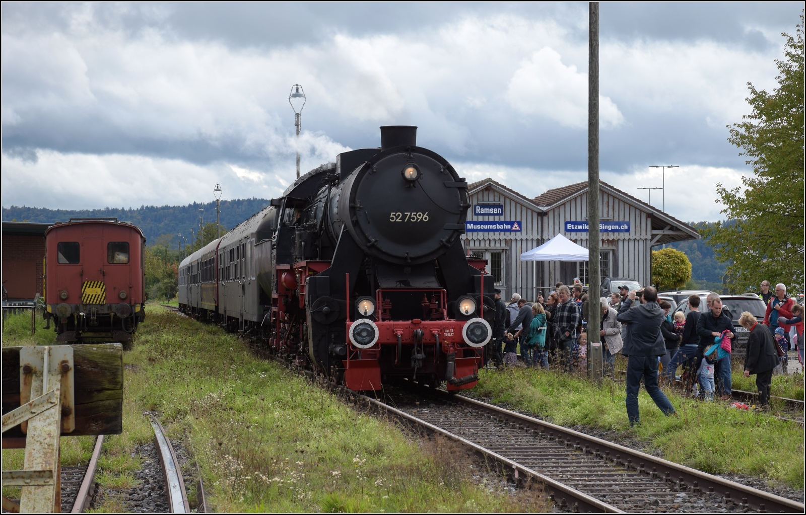 Schienenverkehr am Schienerberg. 52 7596 mit ihrem EFZ-Sonderzug für die SEHR & RS fast startklar in Ramsen auf ihrer Grenzgängertour des Schweizerbähnle. Eine Erfolgsgeschichte für eine Museumsbahn mit vielen Unterstützern und einem Happy End nach vielen Widerständen zeigt sich in der Durchführung solcher wunderbaren historischen Fahrten. Oktober 2022.