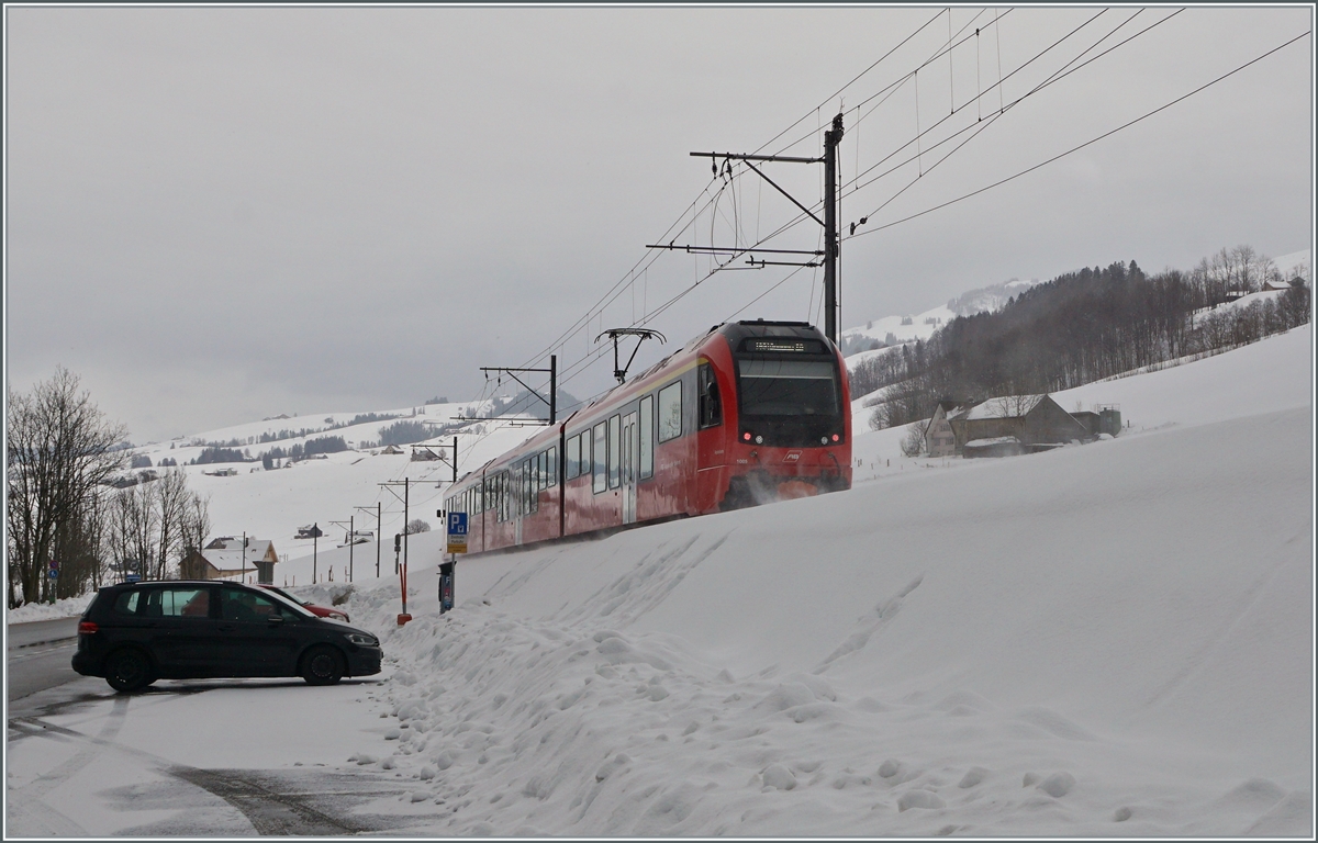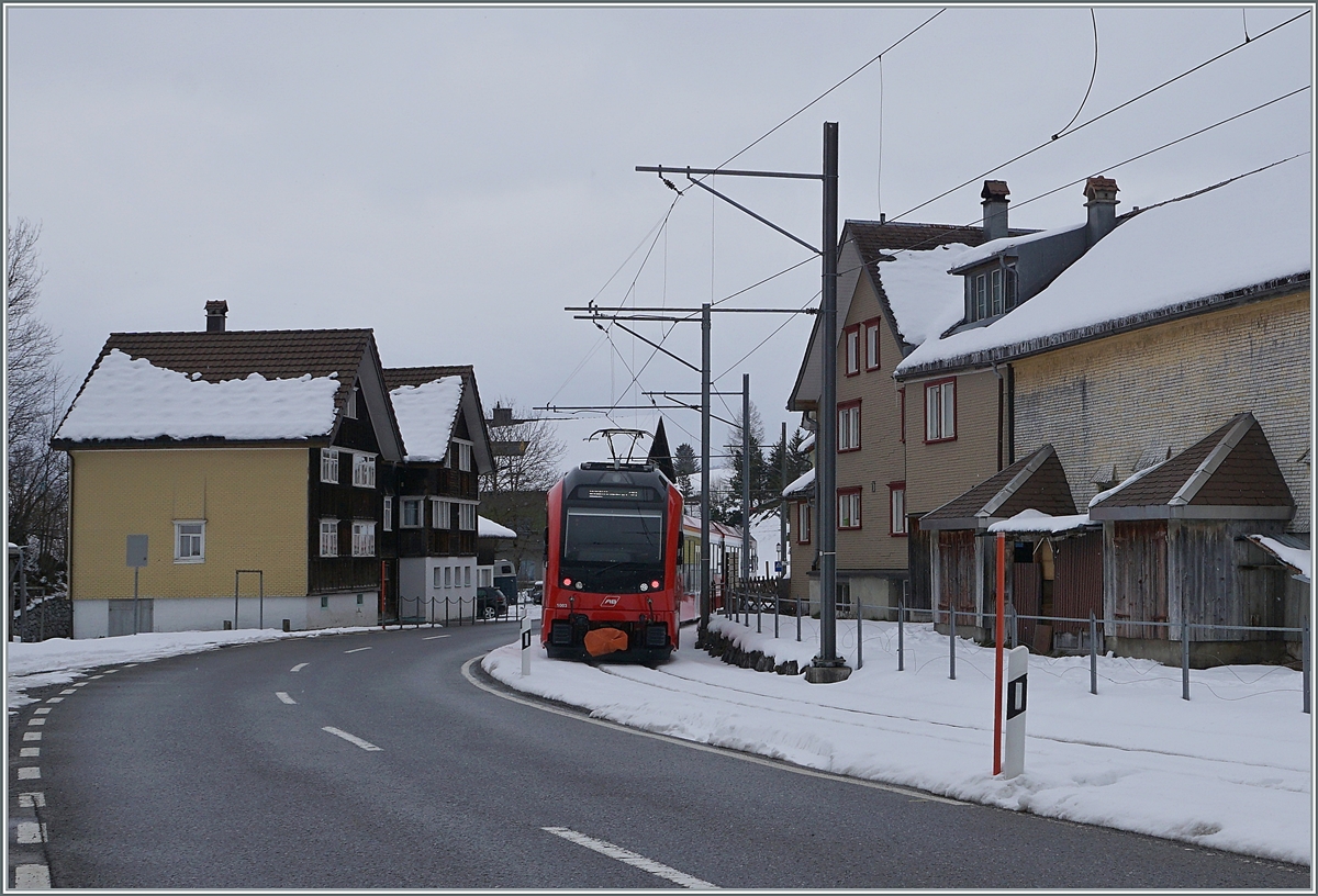 In Appenzell steht ein Regionalzug der SGA nach St.Gallen (von hinten zu sehen), während auf dem Gleis nebenan der Regioanlzug von Wasserauen nach Gossau eintrifft.