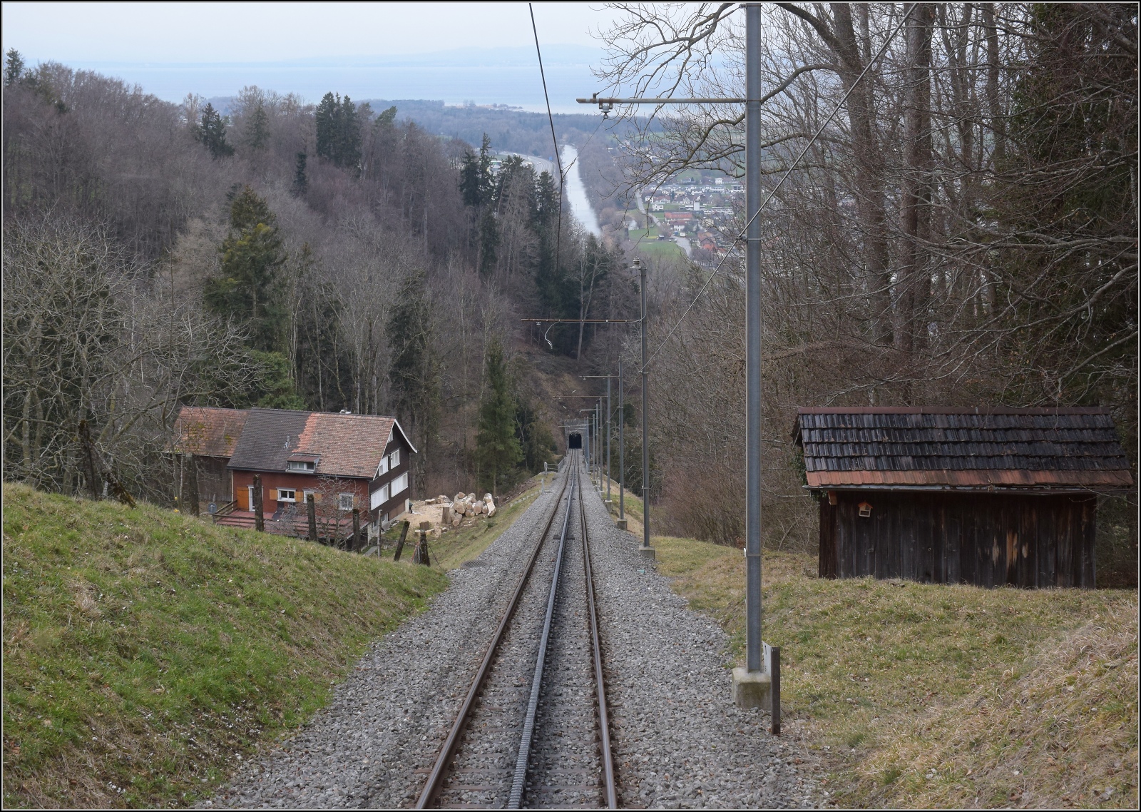 Der einzige Triebwagen BDe 1/2 der Rheineck-Walzenhausen Bahn unterhalb Walzenhausen. 27.Februar 2023