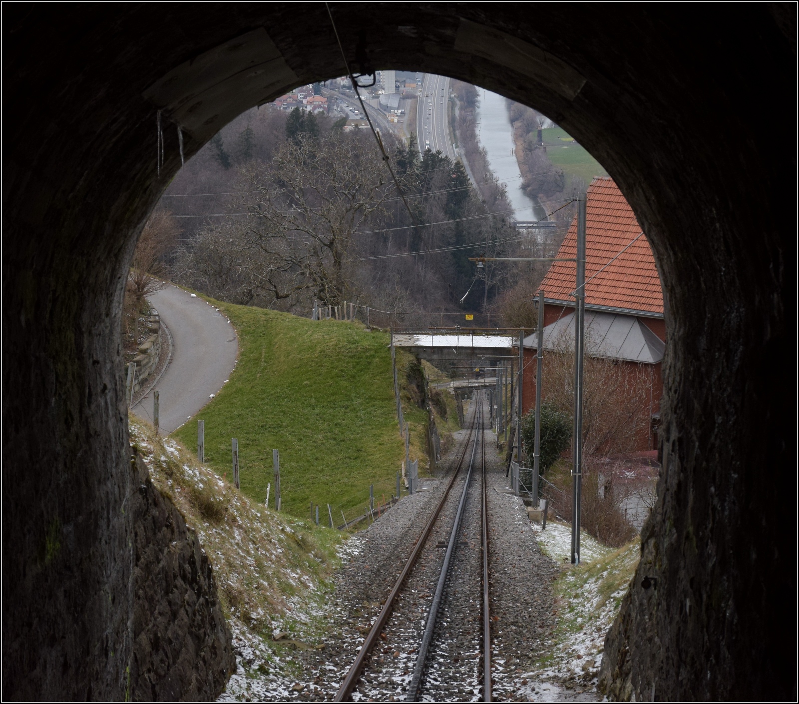 Die Strecke der Bergbahn Rheineck-Walzenhausen auf halber Höhe. Beim Hof haben wir die Kantonsgrenzen überschritten. Walzenhausen, Februar 2023.