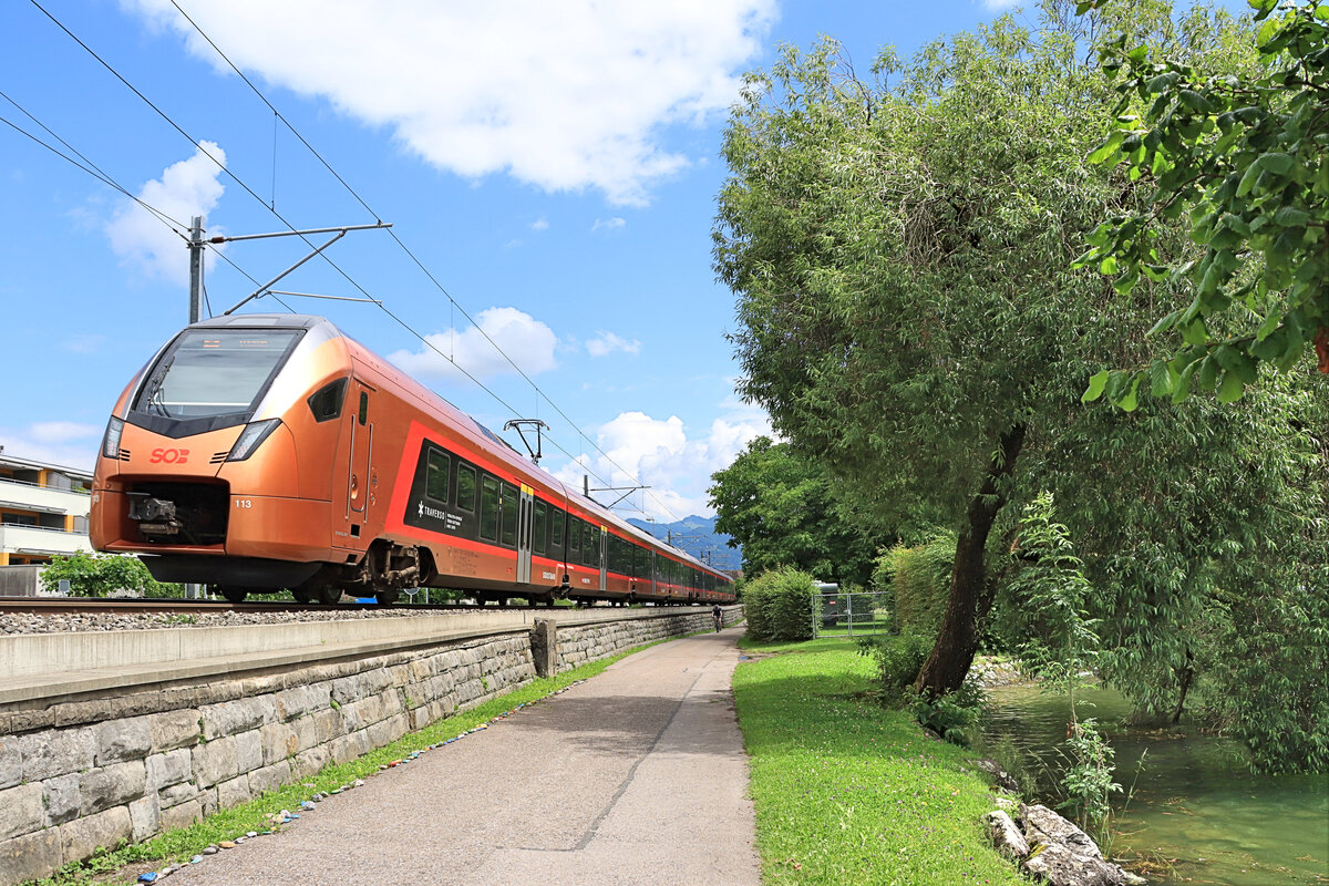 Schmerikon, am allerobersten Zipfel des Zürichsees: Hier regiert die Südostbahn mit ihrer Fernverkehrslinie Luzern-Arth Goldau-Rapperswil-St.Gallen (Voralpen Express) und ihrer Regionallinie St.Galler S-Bahn Linie 6 Rapperswil - Uznach - Schwanden GL. SOB Flirt 526 060, 9.Juli 2021 Peter Ackermann