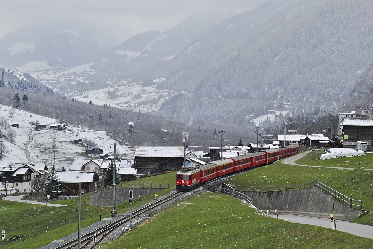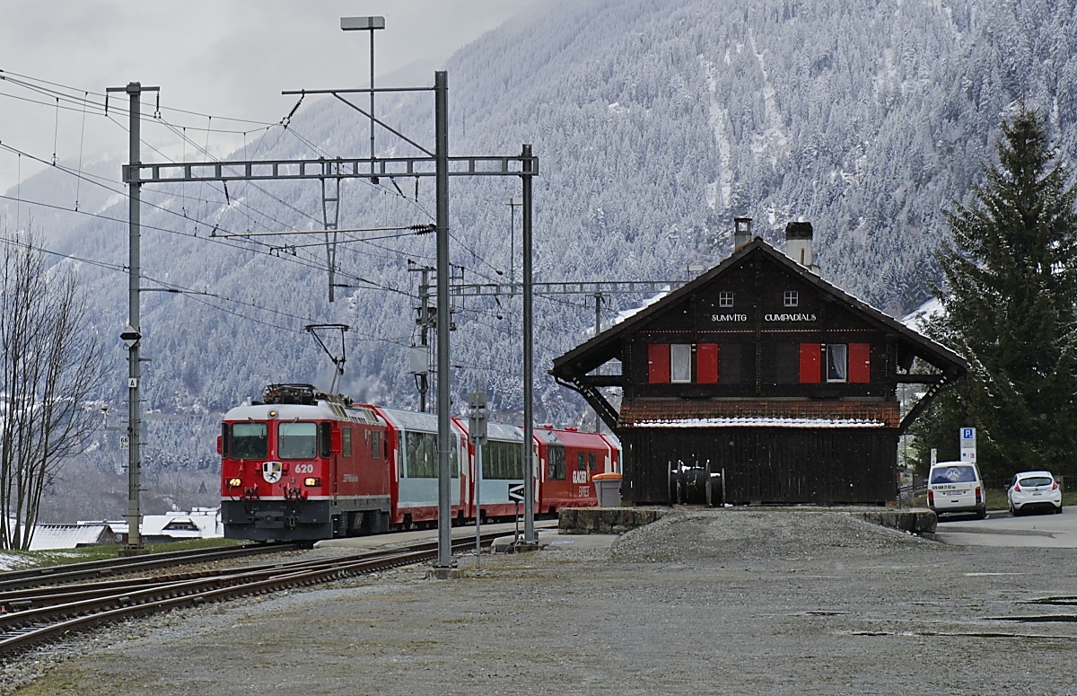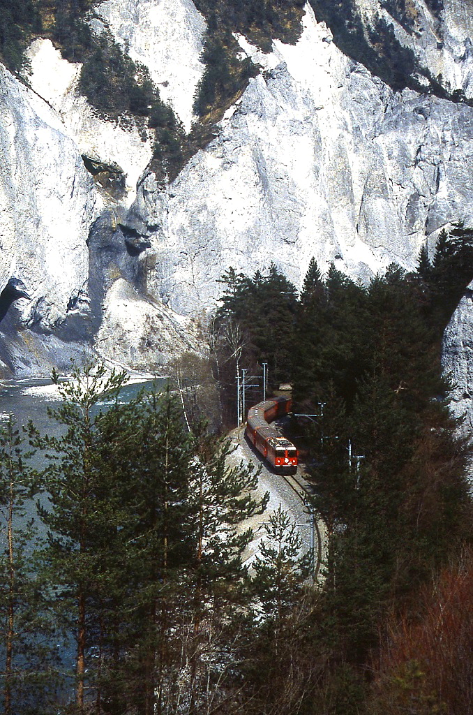 Mit einem RE von Disentis-Muster nach Scuol-Tarasp durchfährt die Ge 4/4 II 616 "Filisur" die Rheinschlucht bei Versam-Safien. Mit der Werbung soll "Kohle" für die Dampflok 1 der RhB gesammelt werden.