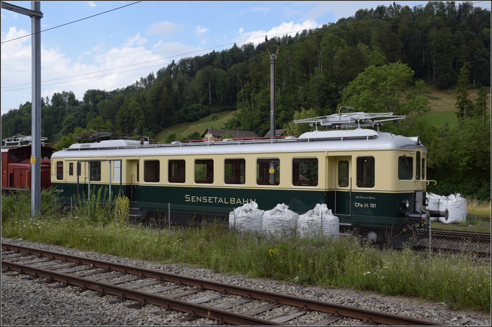 CFe 2/4 101 wurde 1938 gebaut war bis heute das einzige Neufahrzeug der Sensetalbahn. Heute wird er im Zürcher Oberland von der Zürcher Museumsbahn betreut und trägt den Namen 'Dame de Leman'. August 2023.