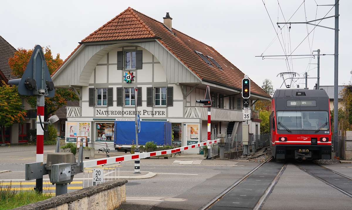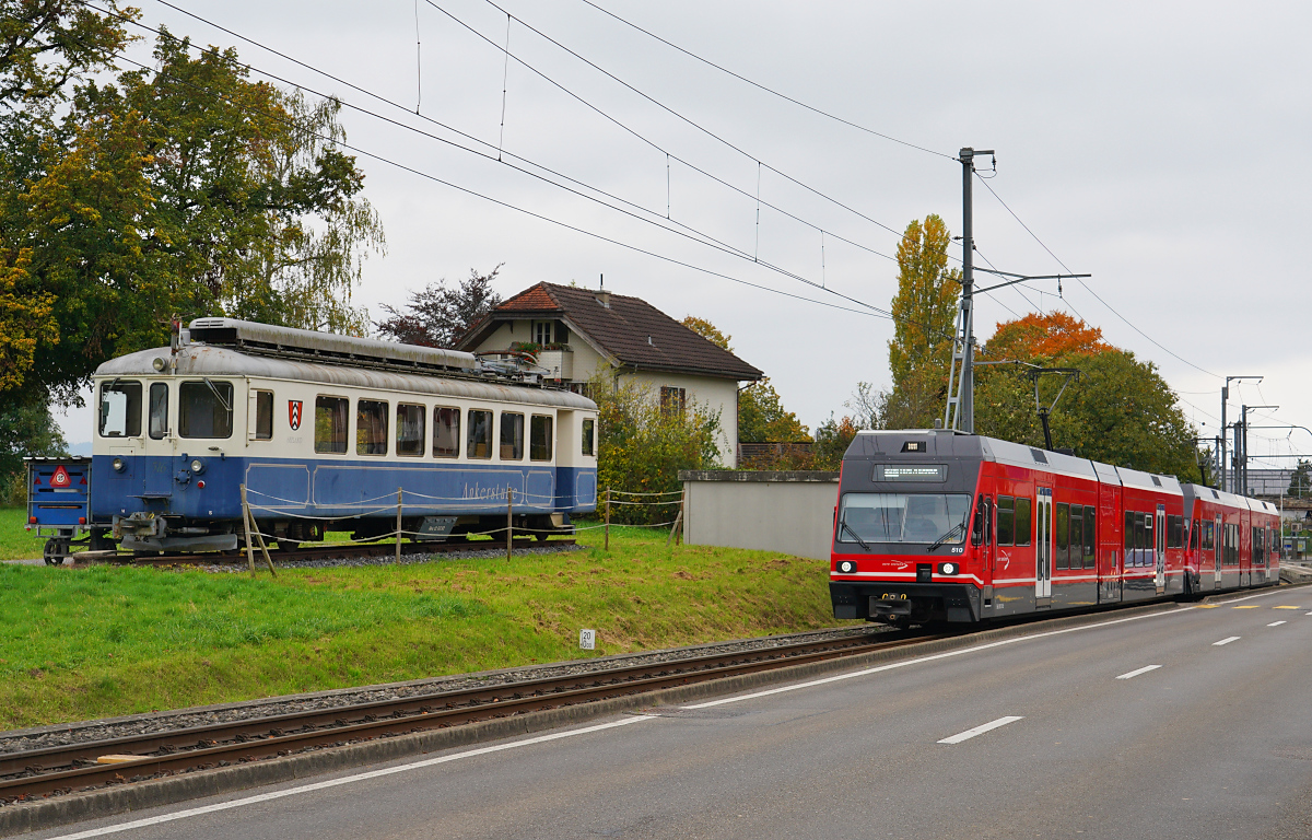 Kurz nach Verlassen des Bahnhofs Ins Dorf fahren die Be 2/6 510 und 503 am 11.10.2025 am ehemaligen BTI-Triebwagen BDe 4/4 5, später BRe 4/4 516 und heute Restaurant "Ankerstube", vorbei Horst Lüdicke
